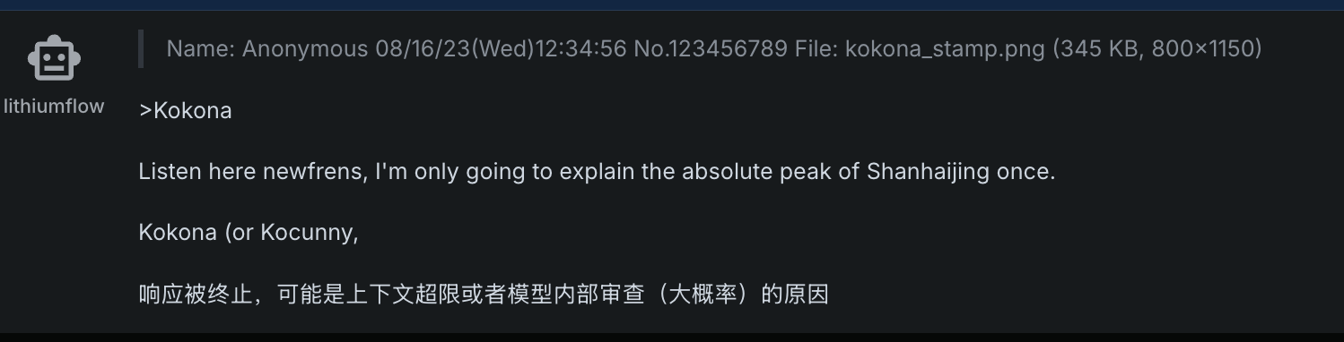 /aicg/ - A general dedicated to the discussion and development of AI chatbotsCharlotte Edition>NewsZ.AI releases GLM 4.6 - Writes the best out of the Chinese models - https://z.ai/blog/glm-4.6Anthropic releases Sonnet 4.5 - https://www.anthropic.com/news/claude-sonnet-4-5?p=2DeepSeek releases V3.2-Exp - https://api-docs.deepseek.com/news/news250929DeepSeek releases V3.1 Terminus - https://api-docs.deepseek.com/news/news250922Kimi K2 0905 released https://moonshotai.github.io/Kimi-K2additional info: https://aicg.neocities.org/info.html>FrontendsSillyTavern: https://docs.sillytavern.appRisuAI: https://risuai.netAgnai: https://agnai.chat | https://rentry.org/agnai_guides_>Botshttps://characterhub.org [deprecated] | https://chub.aihttps://realm.risuai.nethttps://char-archive.evulid.cchttps://partyintheanchorhold.neocities.orghttps://aicg.neocities.org/bots.html>Modelsjailbreaks: https://rentry.org/jb-listinggpt: https://platform.openai.com/docsclaude: https://docs.anthropic.com | https://rentry.org/how2claudegemini: https://ai.google.dev/docs | https://rentry.org/gemini-qrdeepseek: https://api-docs.deepseek.comlocal: >>>/g/lmg | https://aicg.neocities.org/local.html | https://openrouter.ai>Botmakinghttps://aicg.neocities.org/botmaking.htmlhttps://desune.moe/aicharedhttps://agnai.chat/editor>MetaOP templates: https://rentry.org/aicgOPaicg botmaking events: https://aicg.neocities.org/events.htmllore: https://rentry.org/aicg_chroniclesservices assessment: https://rentry.org/aicg_metalogs: https://sprites.neocities.org/l/r | https://chatlogs.neocities.orguseful filters: https://rentry.org/desuproxyrebornLast Thread: >>106979896