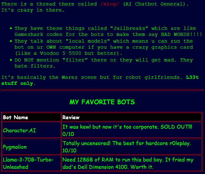what kind of bots does /g/aicg/ likefor me, it's lonely monstermen who need a hug