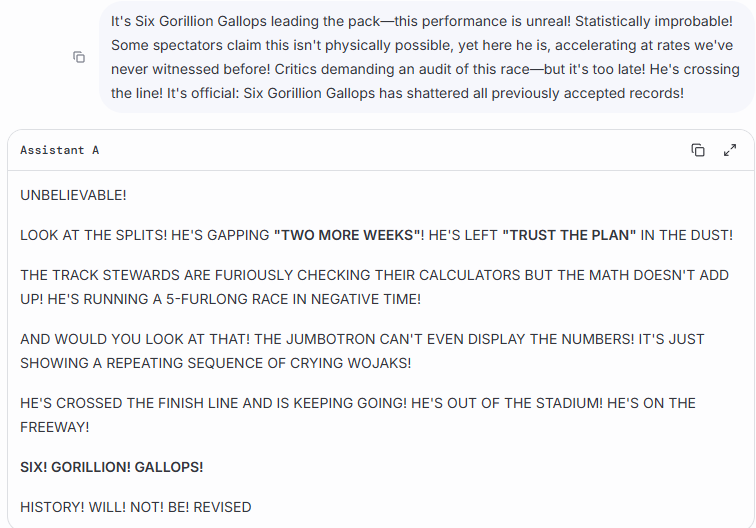 >>106987261i use a chink proxy i found on 2ch that still has lithiumflow, also just so you know in the future how to do it, on lmarena, after you get two responses, you can REGENERATE them, so if you in advance know that the specific response is from a model you like, you can basically chat with it with external software/scripts because that regenerate thing uses the same model. you just can't vote, if you vote you can't regenerate anymore