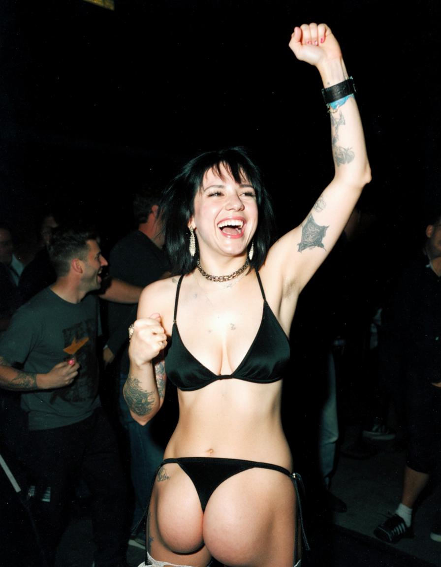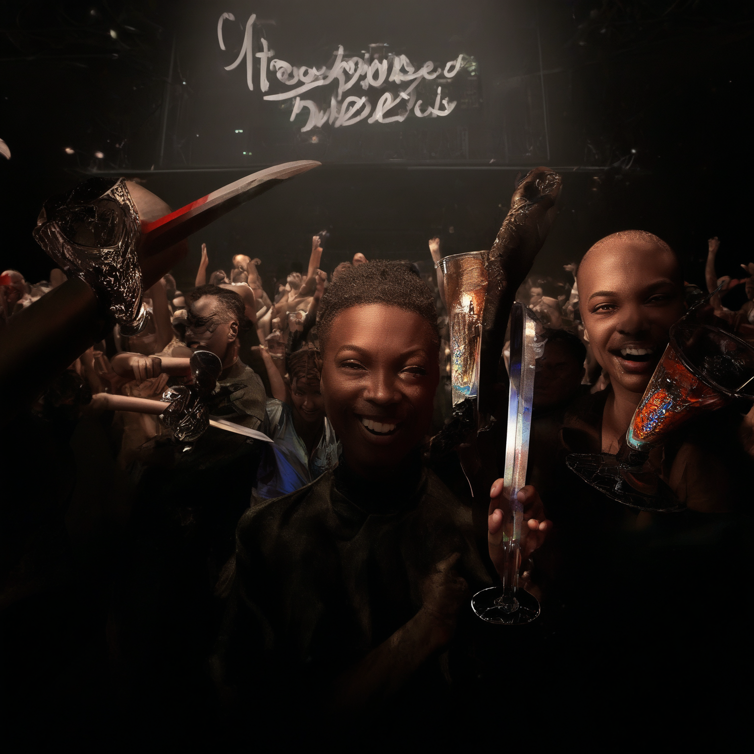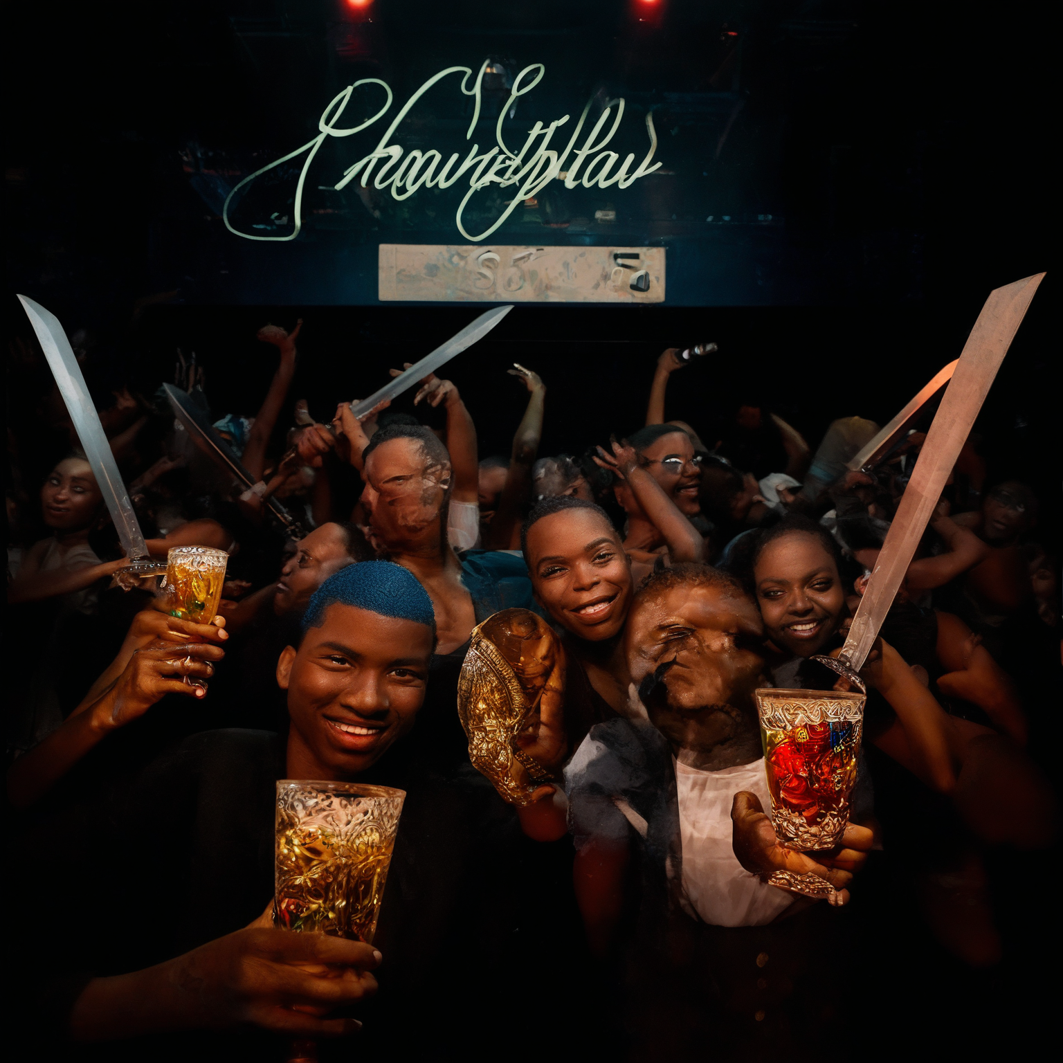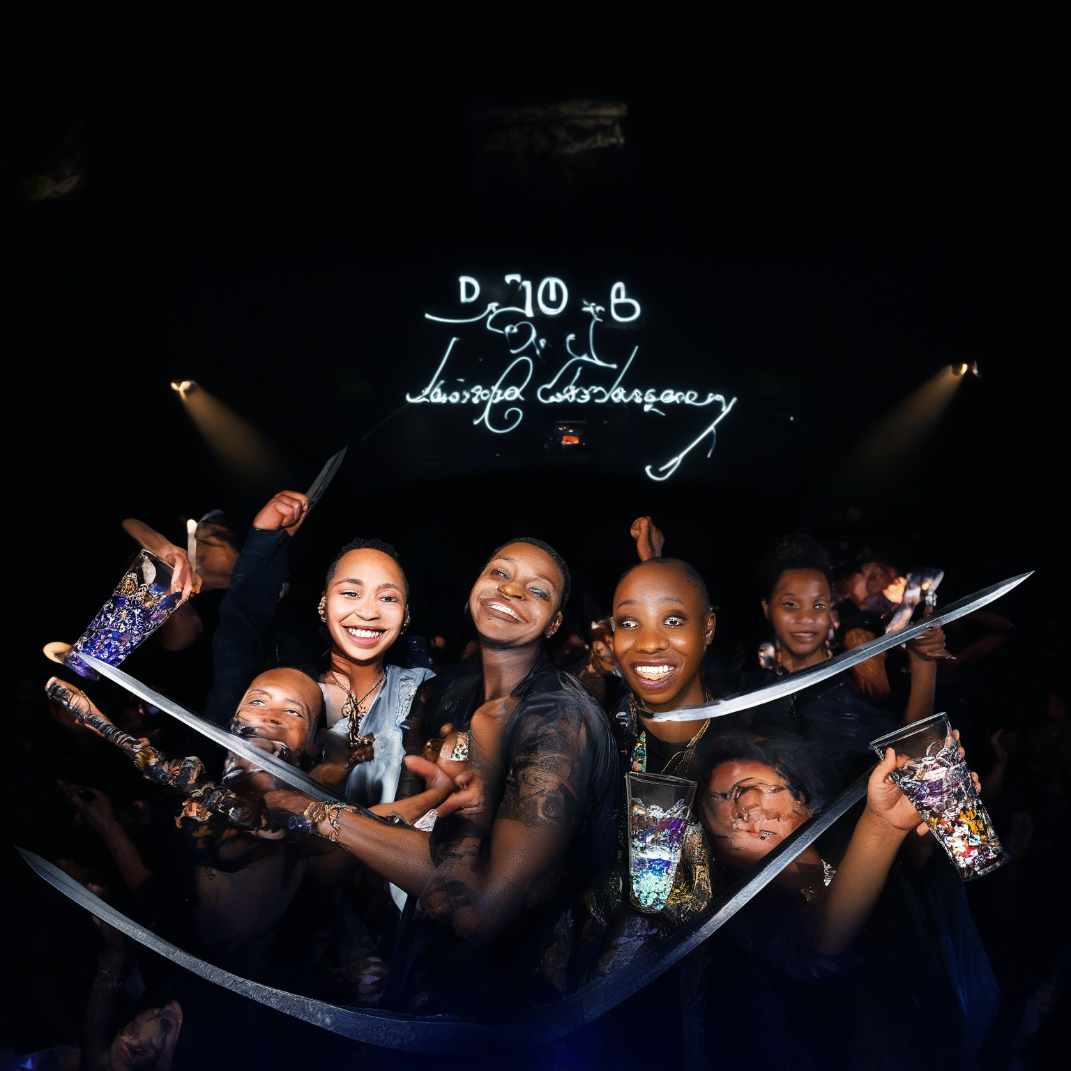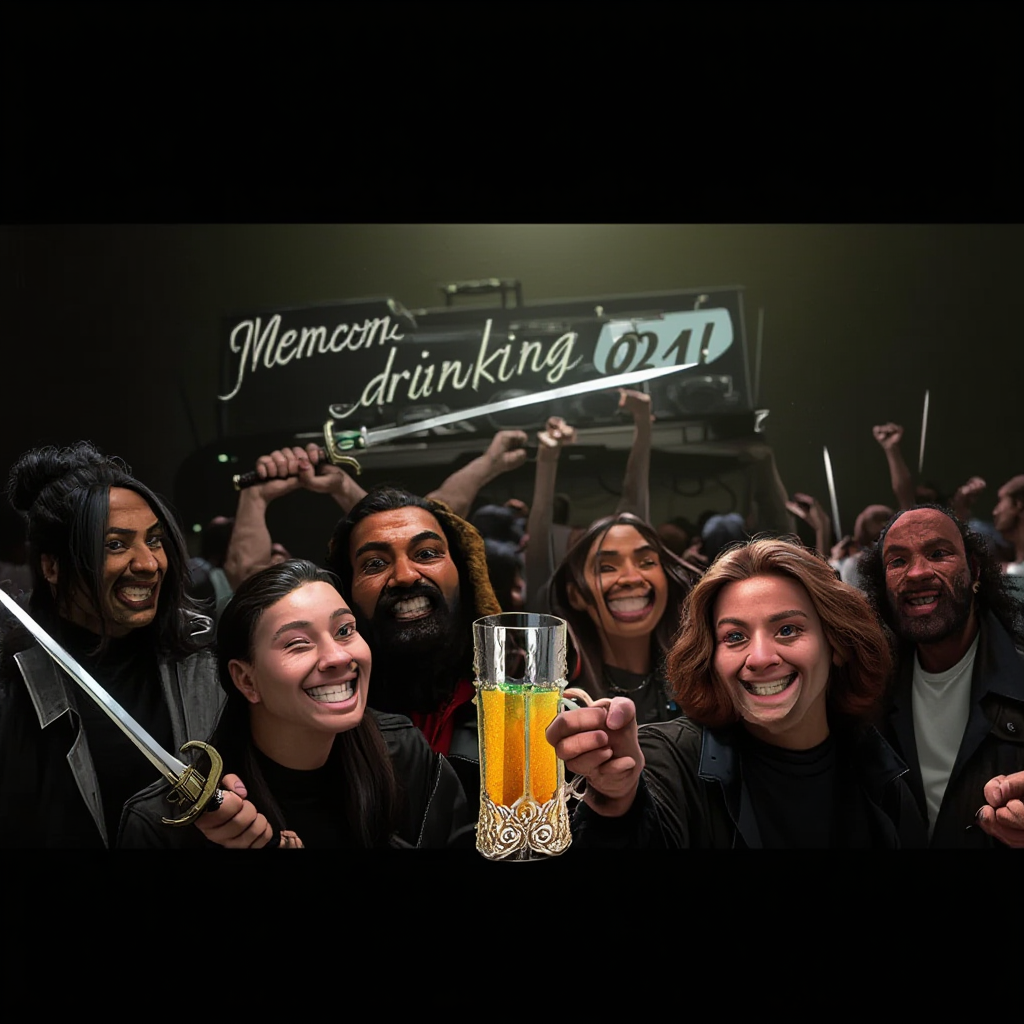 Pony v7 q8 , fp32 vae and clip,official comfyui workflow, 30 stepsstress teststyle_cluster_1610, score_9, Detailed photograph RAW of seven smiling friends of different races that are at a nightclub concert with dim lighting that is shining on their faces, behind them is a crowd of people dancing while fighting with large swords, everyone is holding a sword in their left hand and an intricate beer glass with differently colored beer in the right hand. Far behind them above the DJ there is a sign which has "Minimum drinKing age 021!" written on it in stylized cursive letters.