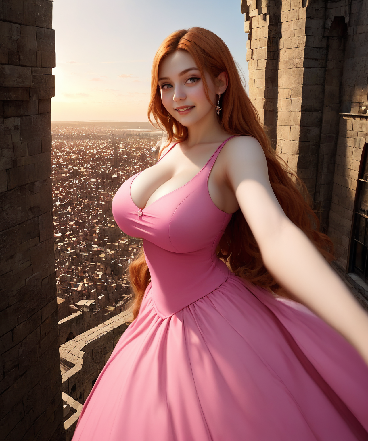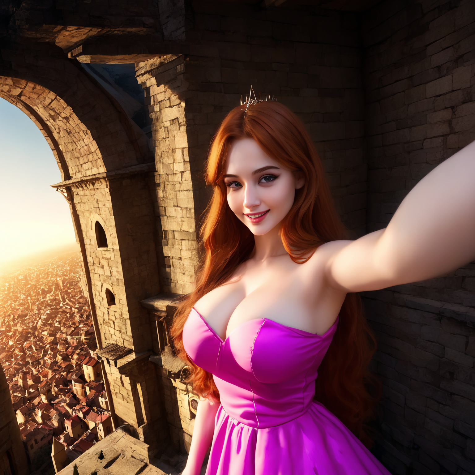 >>107007369>>10700736540 steps score_9, Attractive medieval princess taking a selfie in a pink ball dress, long ginger hair, pale skin, large breasts, smile. She is at the top of a tall stone tower, with a large window behind her that overlooks a huge and crowded medieval city at sunrise.