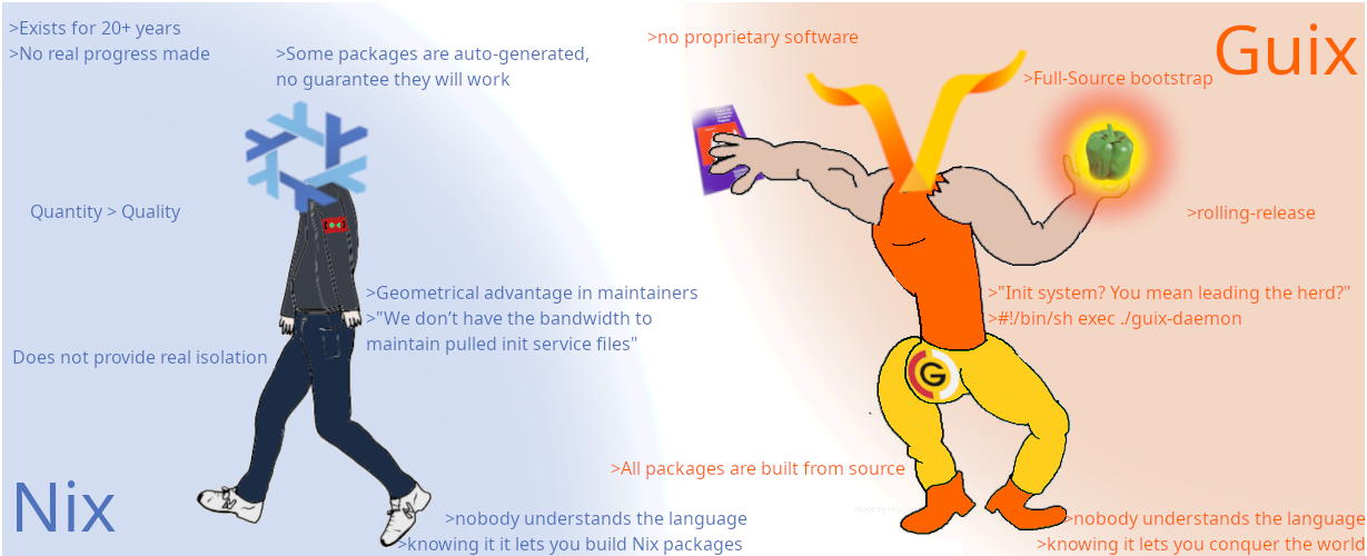>>107014965>nix already wonNot reallyThere are many competing nix forks now (Lix, Snix, Eka, etc.), all while the NixOS foundation is in the middle of a "civil war" between SJW troons and Anduril chuds. No flakes, no proper documentation, good Nix devs being banned, endless drama... Not really a win.