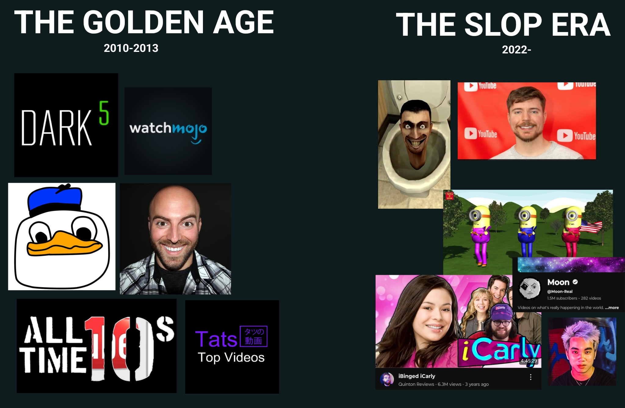>>107037081both absolute garbage, best era was avgn ripoffs, ytps, rick roll and cringy yet soulful AMVs