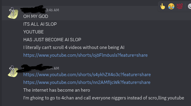 I came to 4chan because I was scrolling youtube and every 3 shorts was AI. and it's your fault. niggers.fuck you. 3d print guns.