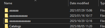 Plain English just works.There are actual monkeys here just rolling their faces on the keyboard for file and folder names? Good lawd.\Miscellaneous\temp\Photos\Stable Diffusion\Taxes\RecordingsNo weird quirks. I just need functional names, not bullshit. If I cannot decide on a subfolder name, I use the current date or current month + year (Jan2025, Aug2025, Mar-25-2025, etc.). Unsorted files I prefer to stick in their own folder and call it "to be sorted".