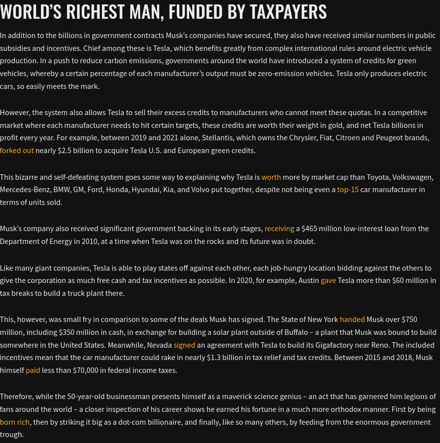 >>107046283>He's the main liability for that company.kek no hes a clown to watch while your money disappears and freedoms erode further'his' solution is totalitarianism police state, which is different than authoritarianism, keep in mind.https://www.mintpressnews.com/elon-musk-not-renegade-outsider-cia-pentagon-contractor/280972/