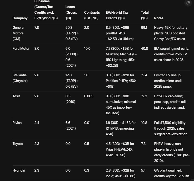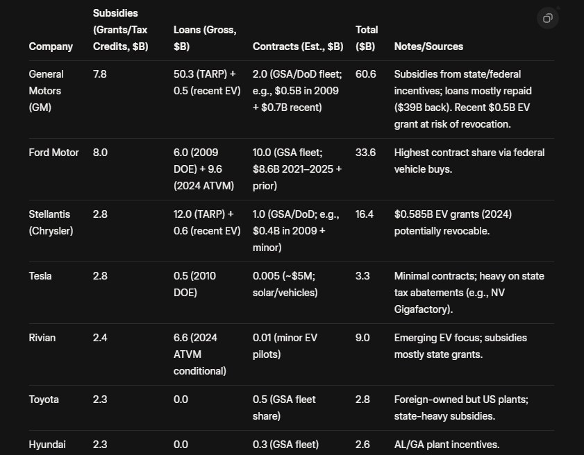 >>107046812Retard>>107046839Because their brains are rotted. They uniquely think Tesla is the only car company in the world that takes advantage of government subsidies, loans, contracts. Pics related, over the last 20 years. GM: 60.6 billion dollarFord: 33.6 billion dollarsStellantis: 16.4 billionRivian: 9 billionTesla: 3.3 billionHyundai: 2.6 billionToyota: 2.3 billionThe level of support Tesla gets is roughly same as foreign companies.