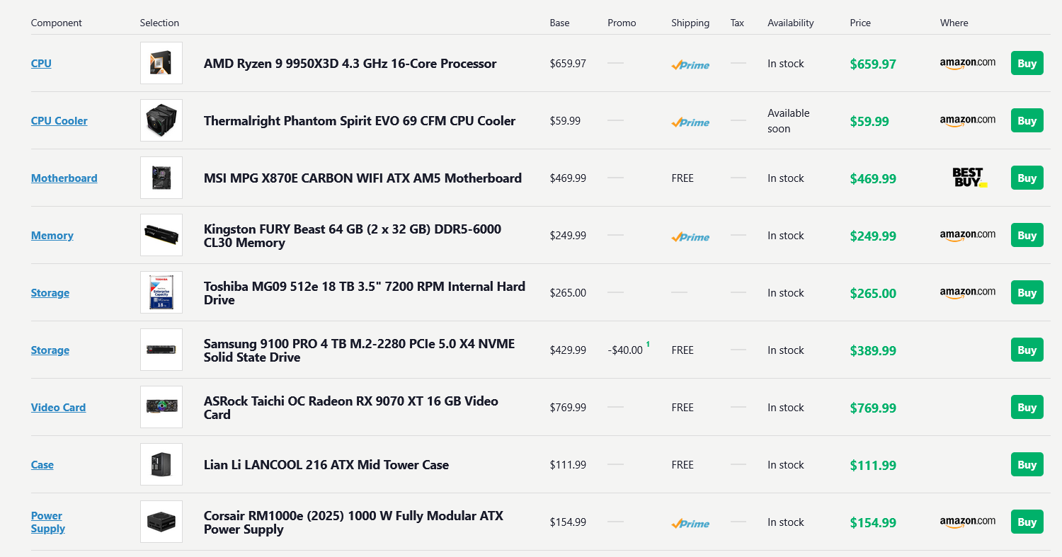 >News & RumorsRadeon AI PRO R9700 officially launched. $1299.99 Retail Price.RTX 50 Super: 2026 launch. 24GB VRAM for 5070 Ti & 5080 Super, 18GB for 5070 Super.265k, 285k, and 9800X3d getting new oc'd variants soonDual 3d cache "9950X3D2">Product NoticePNY RTX 50 cards have QC issues (rattling fans, reports of 5070 & 5090 with blown capacitors)Gigabyte RTX 50 & RX 9000 video cards: thermal gel has QC issues, Gigabyte claims only early production batches were affected.https://www.igorslab.de/en/update-on-thermal-putty-on-gigabyte-graphics-cards-after-further-storage-oil-separation-to-an-alarming-extent-and-silence-as-a-strategy/>PSU Reviewshttps://www.tomshardware.com/pc-components/power-supplieshttps://www.lttlabs.com/https://www.kitguru.net/reviews/?category_name=power-supplieshttps://www.techpowerup.com/review/?category=Power+SuppliesFor tier-list enjoyers:https://docs.google.com/spreadsheets/d/1akCHL7Vhzk_EhrpIGkz8zTEvYfLDcaSpZRB6Xt6JWkc/>Storage Reviewshttps://www.phoronix.com/reviews/Storage (Linux performance)https://www.tweaktown.com/cat/storage/index.htmlhttps://www.techpowerup.com/review/?category=SSDhttps://www.tomshardware.com/pc-components/storage/ssds/reviewshttps://www.servethehome.com/category/storage/>Monitor Hunterhttps://docs.google.com/document/d/1illeNLsUfZ4KuJ9cIWKwTDUEXUVpplhUYHAiom-FaDo/