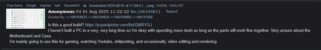 If your PC building questions aren't being answered here, head to the other thread >>107047405This one was started by someone who's been reposting old questions to spam/bump threads to make sure he is the one who creates new /pcbg/ threads.