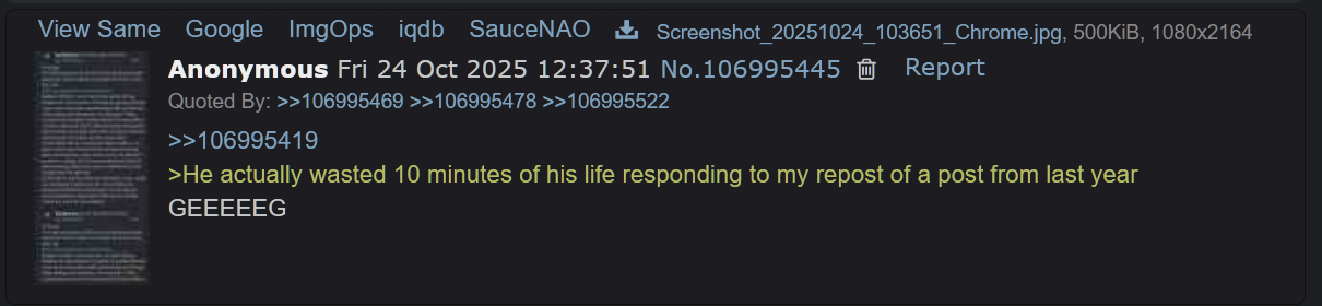>>107048326Listen to this little loser who's beginning to edit old questions to make it harder to find in the archives.This post >>107047422 and all its reply is just one loser desperately bumping this thread up.Here is the source of that original question (Fri 01 Aug 2025)https://desuarchive.org/g/thread/106102891/#106104811Nice moderation btw.