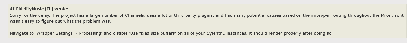 >>107079333Yeah the FL Studio settings have changed quite a bit in the 15 years since that video was made lolfixed sized buffers were already disabled in the wrapper's troubleshooting settings where that option seems to be now.Maybe I'll try experimenting with turning them on?Everywhere says not to/you really shouldn't be needing it but I'll try itI tried tons of stuff, googling, AI, none of it helped. Happy with the mixer rendering as I was recording into Edison beforehand, much slower....