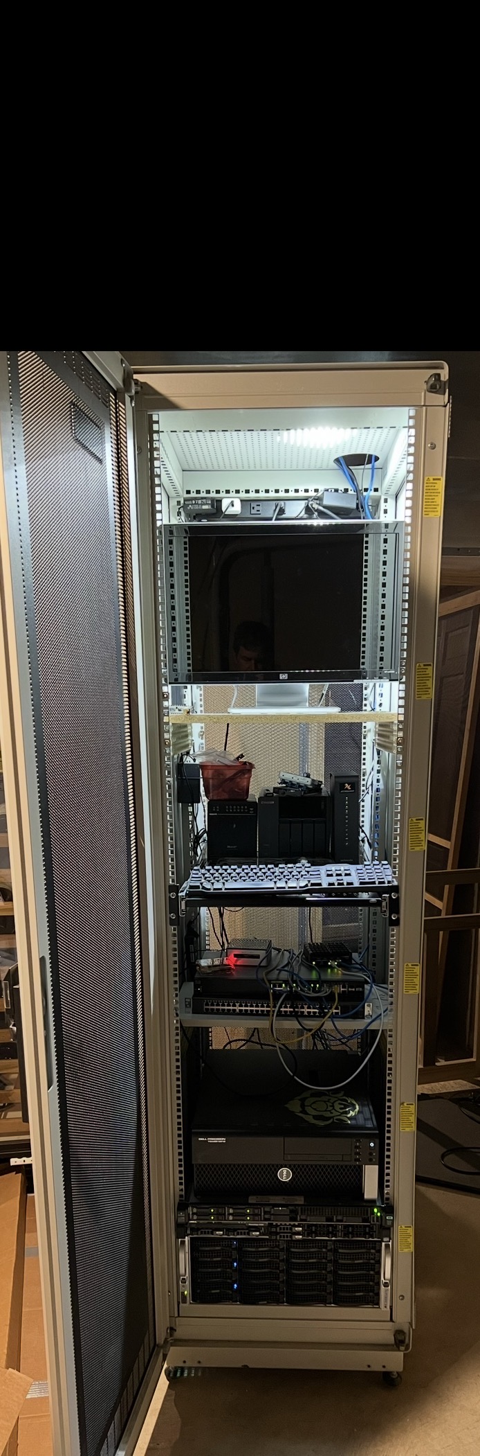 >>107048040>buy gigatall server rack>only 4U worth of rackmounted devices are installed in it (not sure whats on the very bottom but it doesn't look racked)>throw personal PC, wifi router, printer and UPS into the thing on shelves>"yeah i think this looks gas"