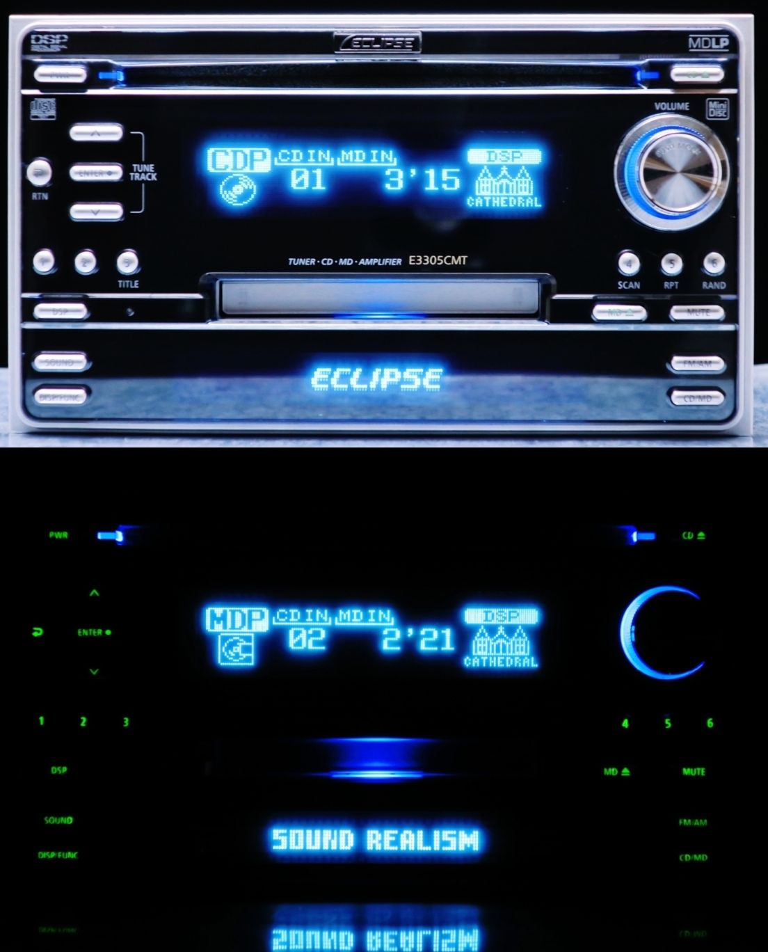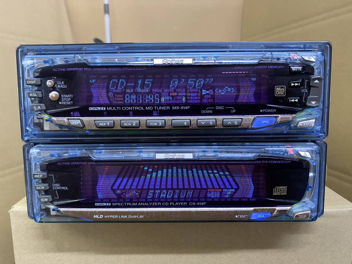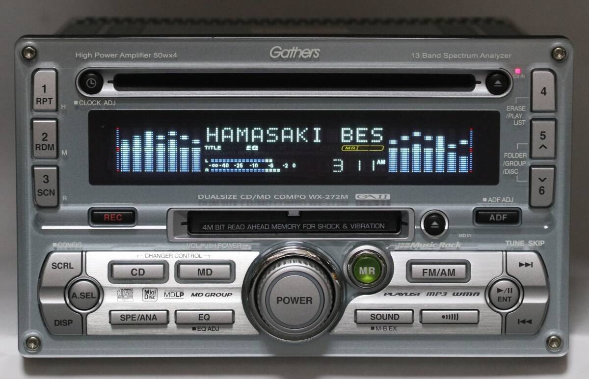 Alpine double din with CD/MD. On the up model you could run an extra wire to the battery to increase the Amplifiers output from 45W to 60W a channel.