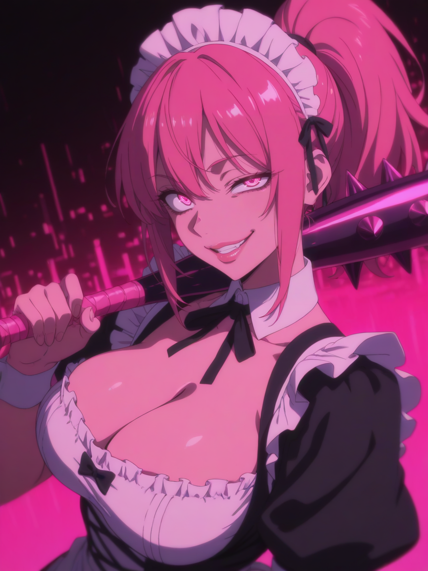 >>107066316>masterpiece, ultra-HD, high detail, best quality, 8k, best quality, ergonomic, depth of field, (anime coloring, anime screencap:1.5), official art. refined detailed, 1beautiful woman, thick lips, saturated, crazy smile, looking at viewer, narrowed eye. high ponytail. large breasts, cleavage. wearing maid uniform and lace headdress. standing looking sweet, holding a spiked bat over her shoulder. deep pink neon background, high contrast, (shoot from side), upper body shot, dynamic composition, dynamic angle. glitch effect,