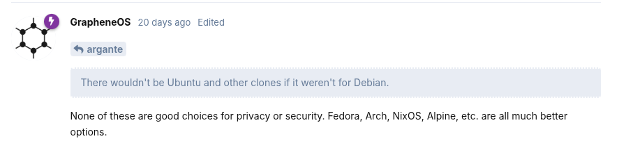 >>107064651I'm confused why he thinks Arch (which by design installs only the most basic of requirements) is more secure than Debian. Arch doesn't even support secure boot. Apparmor and SELinux don't come installed out of the box. Default Arch has to be one of the least secure distros because it doesn't set anything up for you at all.
