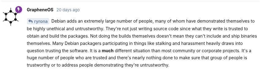 >>107064661i haven't used debian since v4.0, and have been using arch for a along time. but this is retarded. there are a lot of retarded debian packagers out there. and the collective attitude of their community of developers is something else, with them pretending like they can just magically will things into existence when upstreams won't do it for them. but that doesn't negate the fact that they do contribute useful things from time to time, including things with security/safety implications. for example, i believe it was some debian people who started the movement and put a lot of effort into making reproducible builds more common.