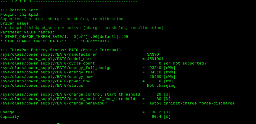 >>107078163>"tlp" or "python3-thinkpad-tools" for Fedora, it appears. Either of them should let you set battery charge thresholds and some other useful Thinkpad related settings.Thanks, I set it up.Although something very curious. After I set it up, I still had the busted battery plugged in, and weirdly enough it no longer showed as critical and actually started charging. After I applied the thresholds it stopped charging and is currently stuck at 30%, although removing the charger causes it to show up as -1% on my DE's battery display. tlp meanwhile shows these stats, I don't know if this means anything specifically. >>107078163>>107079763>Real OEM Lenovo batteries would cost a fortune. Don't believe it's an actual Lenovo battery (or pay a premium for it) just because it has a sticker on it that says so. >FYI, those "genuine oem" batteries for on ebay are counterfeit, just stick to good name brandFunny thing is, I got told in this general a few months ago to avoid third party batteries and to straight up get the Lenovo battery, so whoever told me that can go fuck themselves if it's true that the batteries on the market are usually counterfeits. Damn shame.