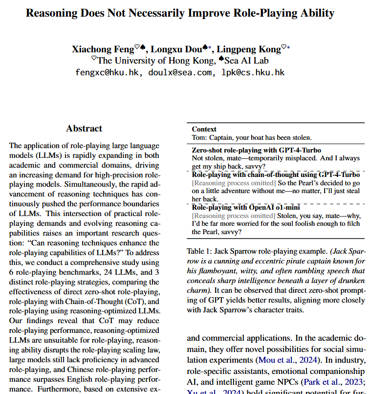 >>107086752Paper:>Reasoning doesn't necessarily improve RP abilityRetard:>CoT severely diminishes roleplay qualityRP ability is the result of purposefully training for roleplaying, nothing more nothing less. Of course if you train it to be a code machine, it will be a code machine, reasoning or not.