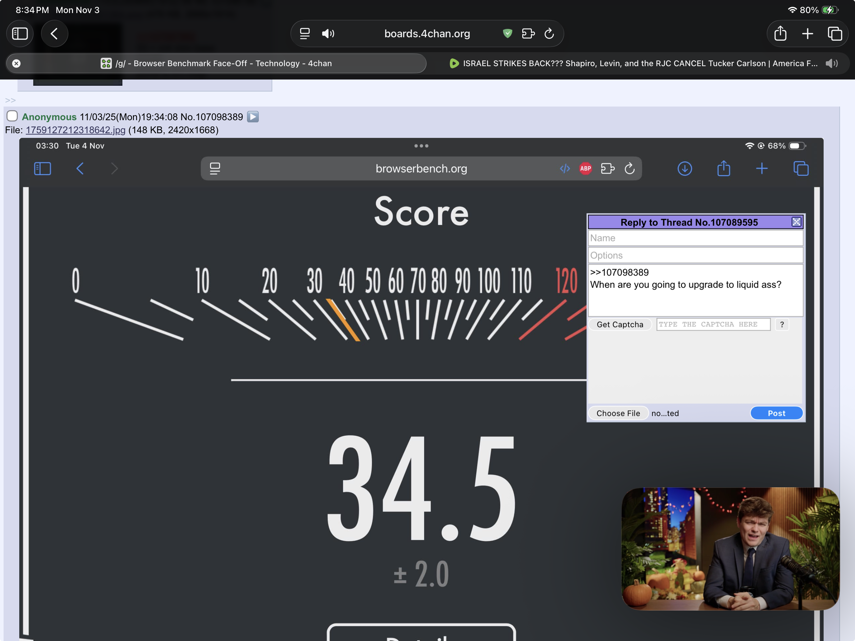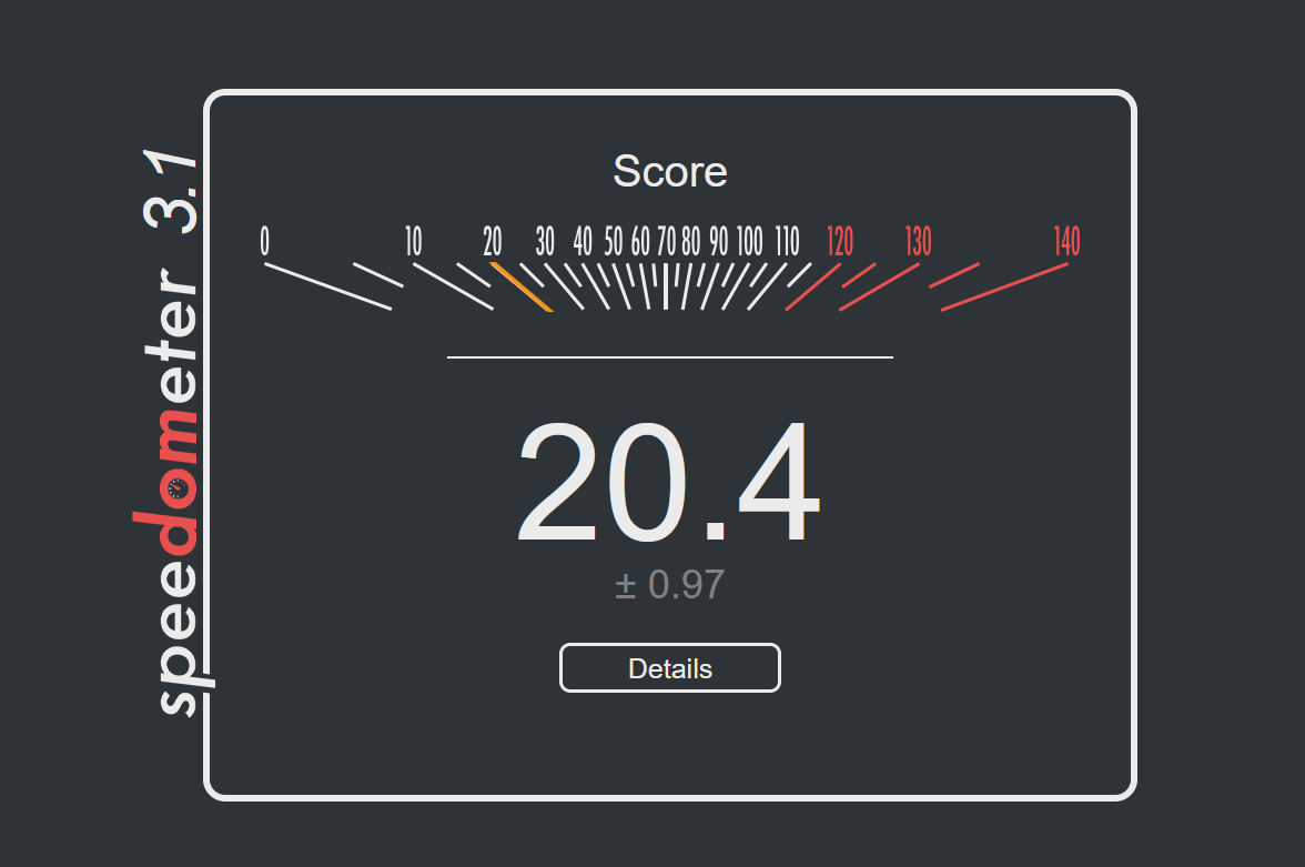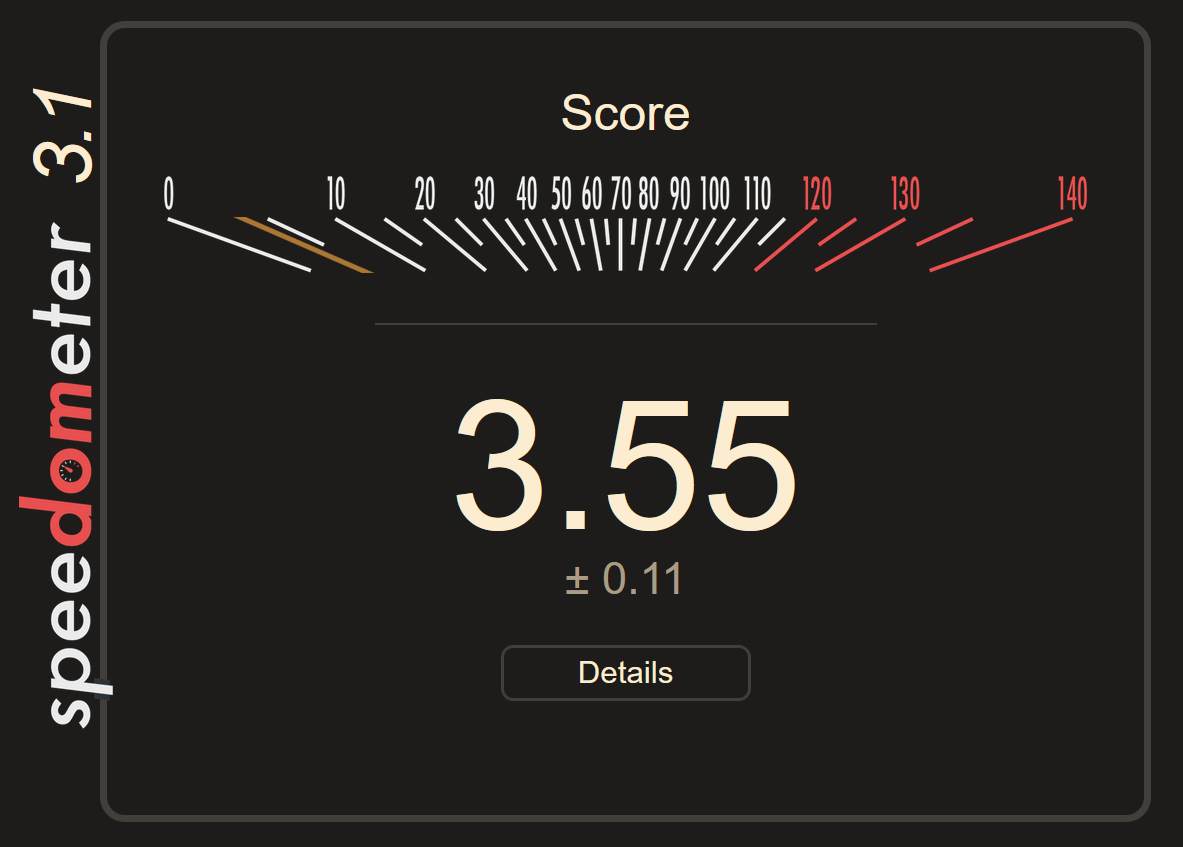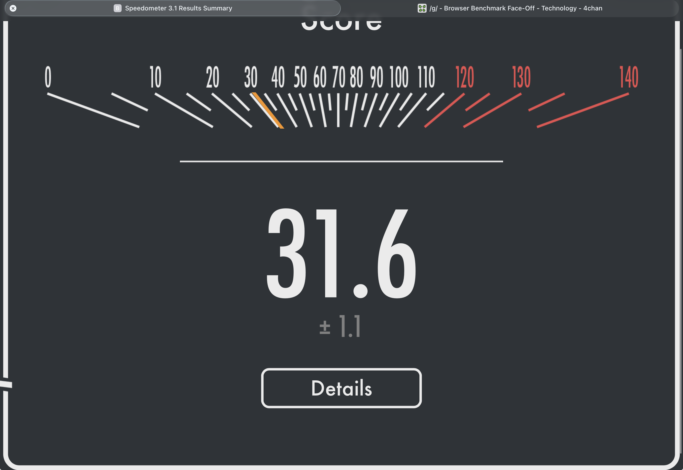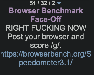 RIGHT FUCKING NOWPost your browser and score /g/.https://browserbench.org/Speedometer3.1/