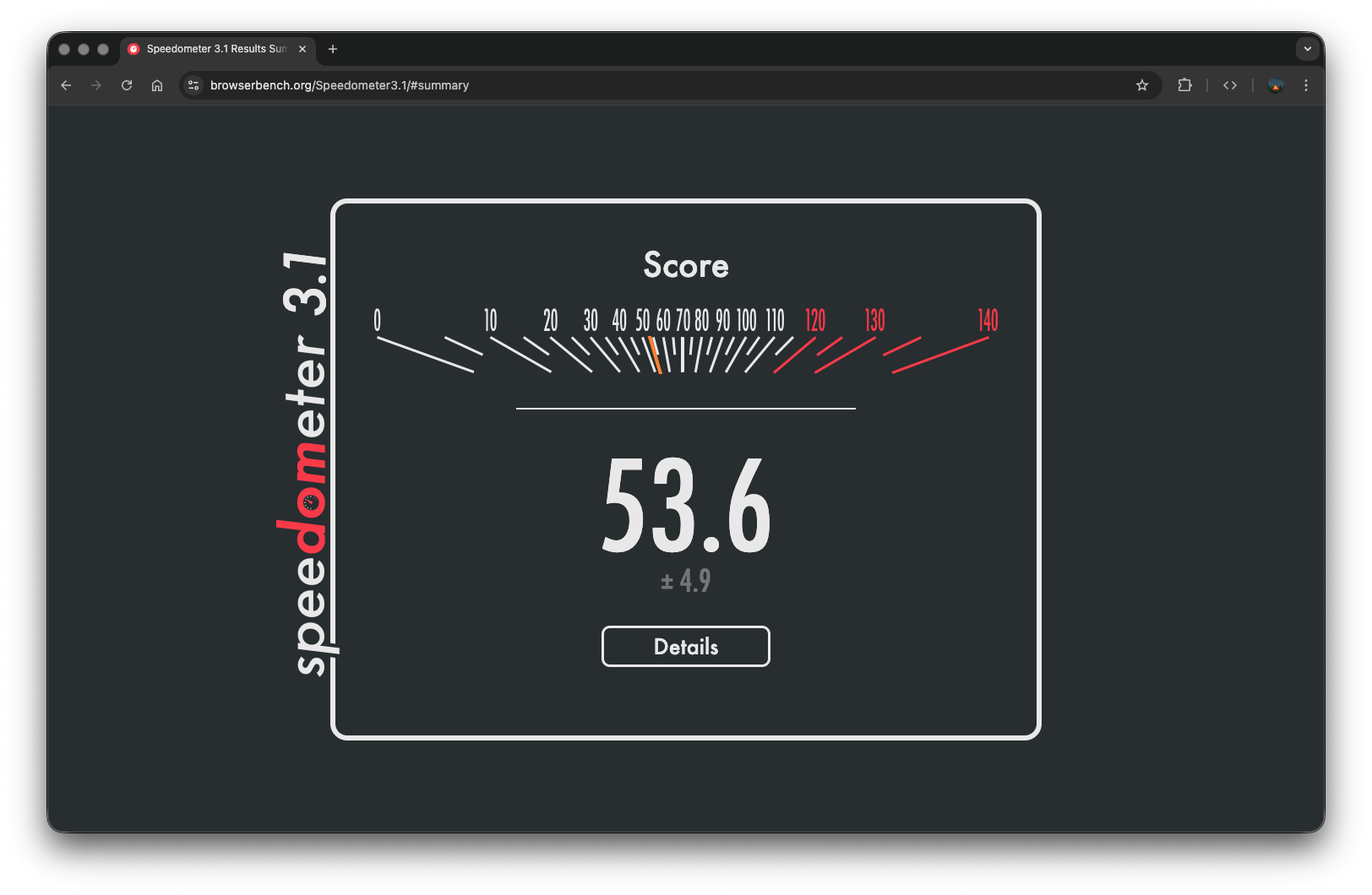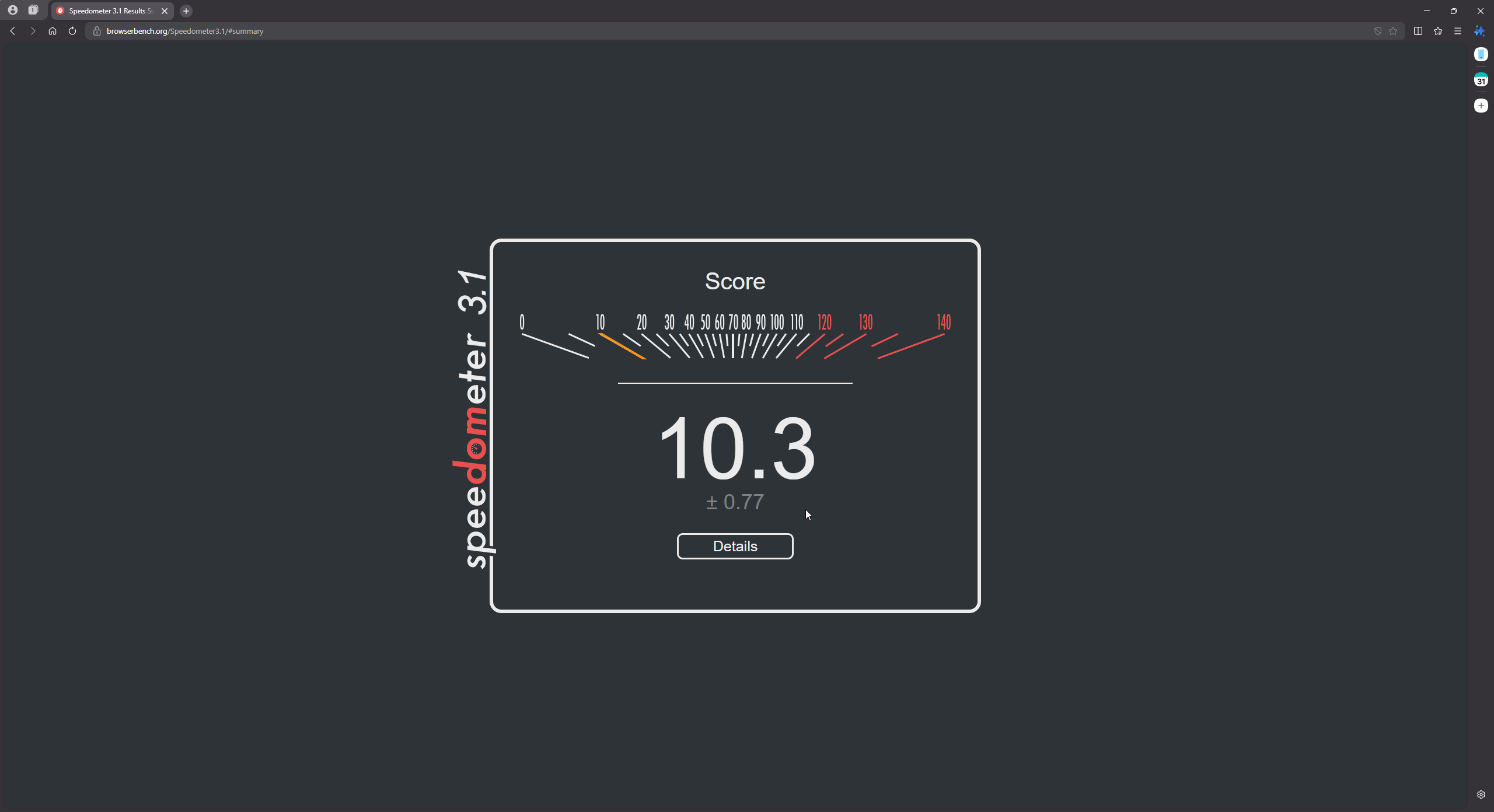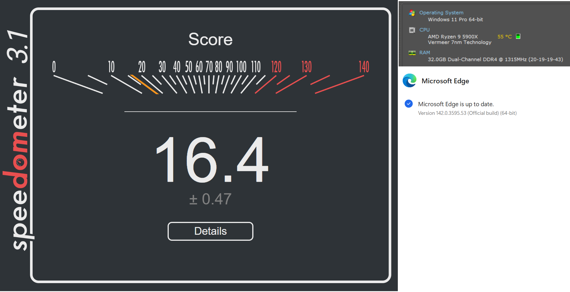 Edge latest on a Ryzen 9 5900X. Seems soft compared to some of the other Ryzen numbers being thrown around here. Do we know if this tester is sensitive to display settings? Running 4x4k, might try playing with it a bit.