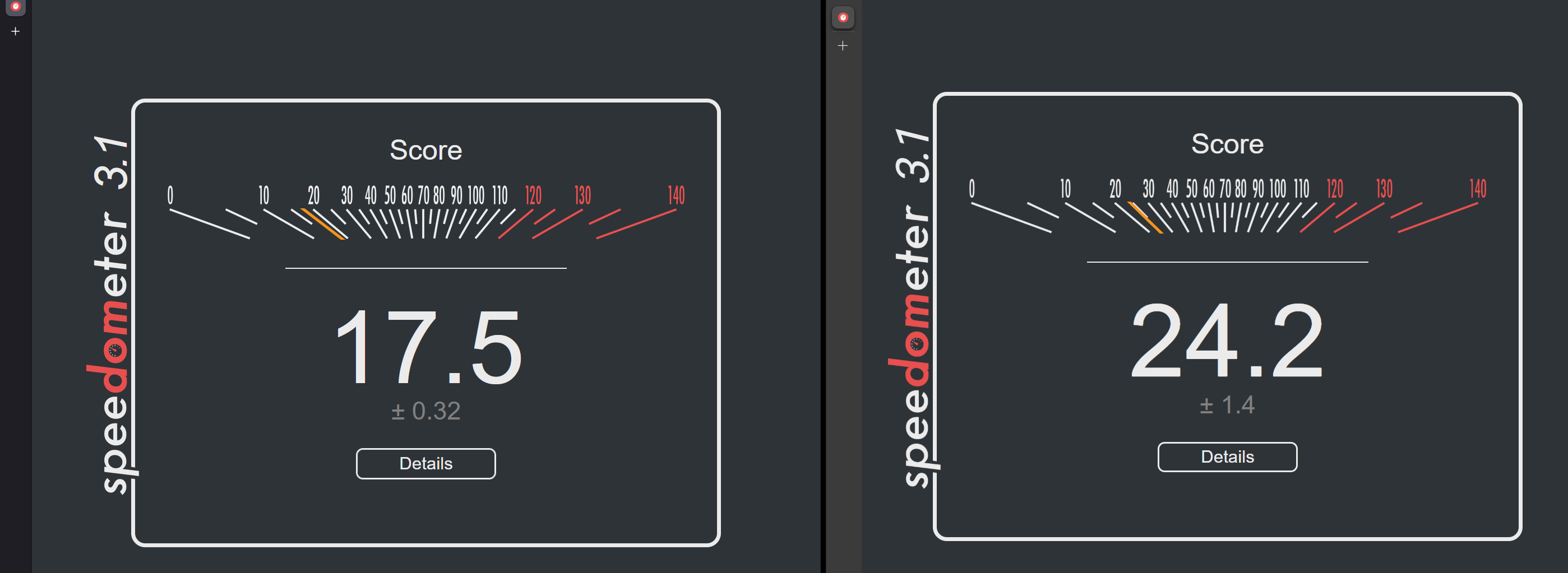 >>107089627>>107089634Quiet system. Browser on the left has no extensions / add-ons. It seems something is eating performance somewhere.