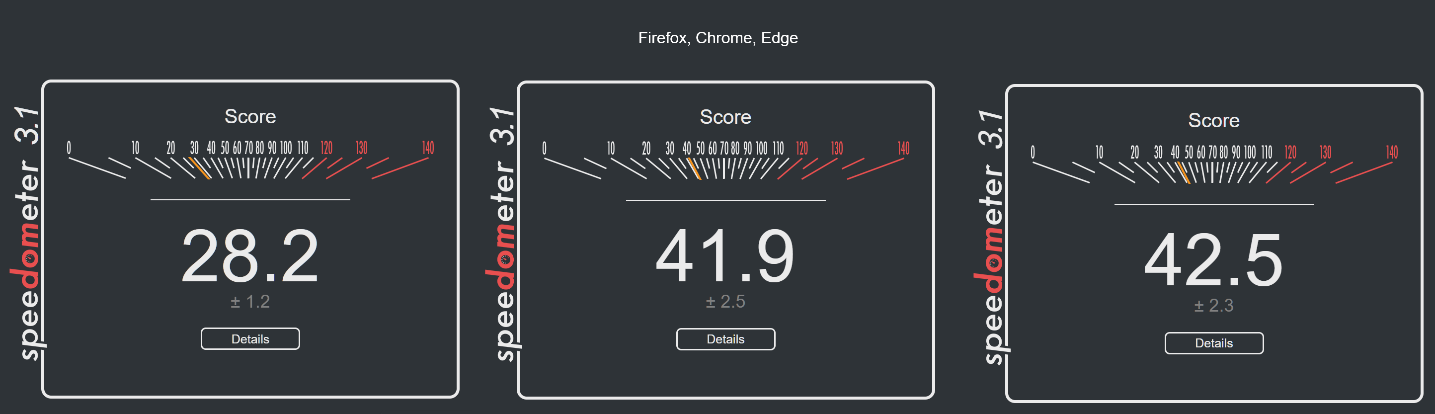 Posting Firefox, Chrome, and Edge benchmarks.CPU is a 14700K, stock boost clocks.