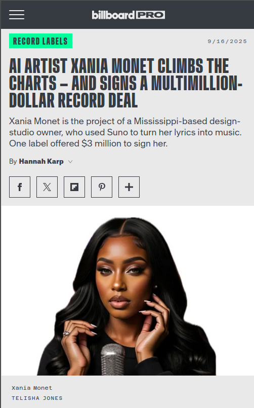 >>107092653>The song first generated public attention as a viral track on TikTok and other social media platforms. Social growth extended to streaming services and digital retailers, prompting the song’s No. 1 debut on the R&B Digital Song Sales chart dated Sept. 20 and a No. 20 start on the multimetric Hot R&B Songs chart a week later. As awareness spread, the song and its creator ignited a discourse of both supportive and opposing perspectives, with SZA and Kehlani among the most prominent opponents.https://www.billboard.com/music/chart-beat/ai-artist-xania-monet-number-1-adult-rb-airplay-chart-1236102665/