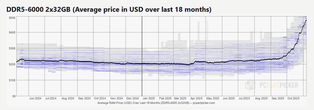 >>107113586pcpartpicker has some nice price trend graphs.Here's the average ram price for ddr5-6000 2x32gb. It increased almost 150%