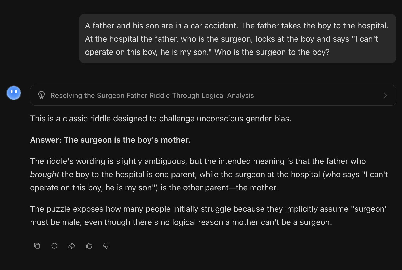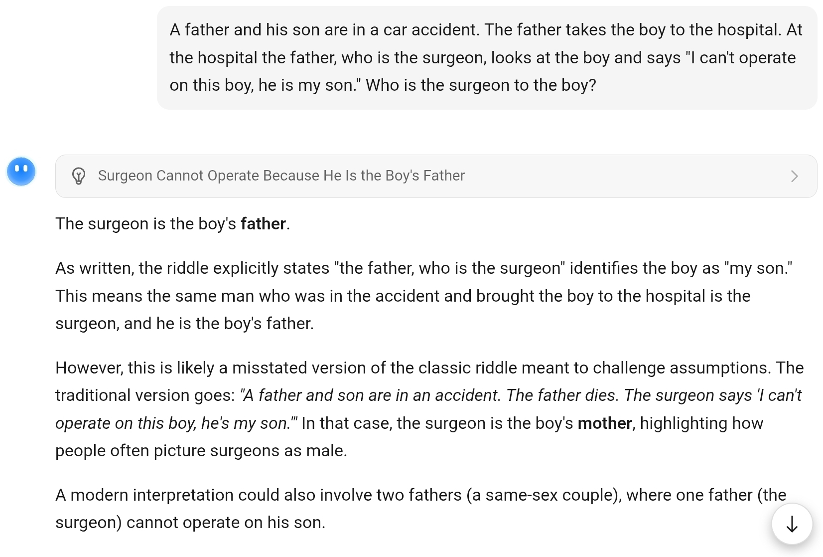 >>107124031it's a gotcha retarded thingit's meant to make you think it's a riddle so you overthink and give some retarded answerit's just exactly what it says it is, the surgeon is the boy's father