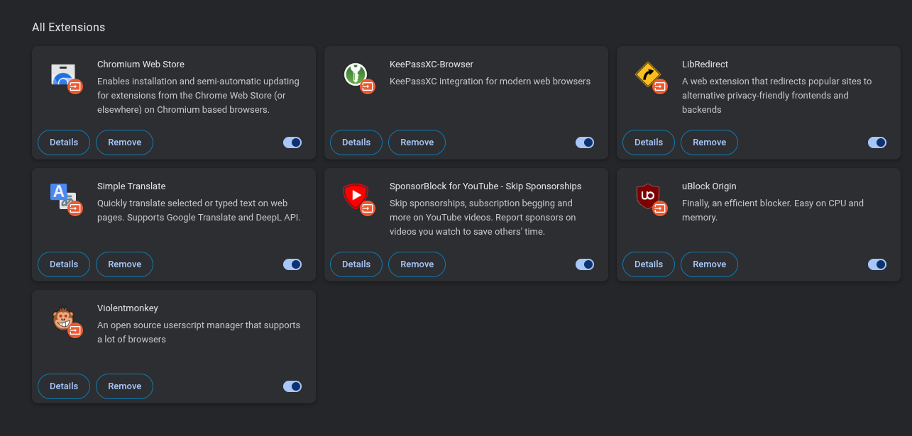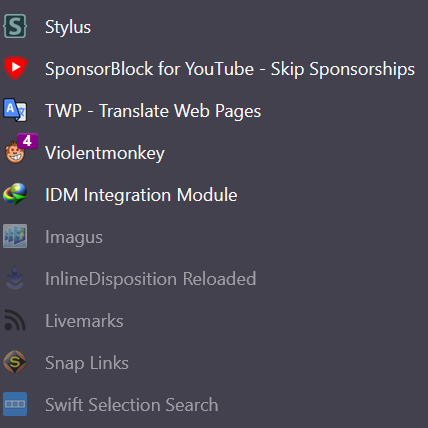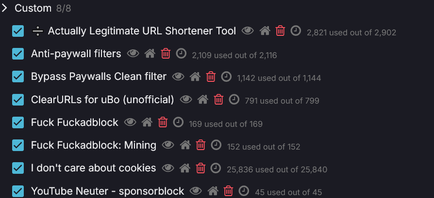 What browser extensions do you lads use?Tried PrivacyBadger but seems worthless/conflicting with uBO, same with ClearURL/Decentraleyes.Tried DarkReader but it's inconsistent and requires constant filtering when it applies to the wrong thing.Seems like uBO truly is all you need in 2025.