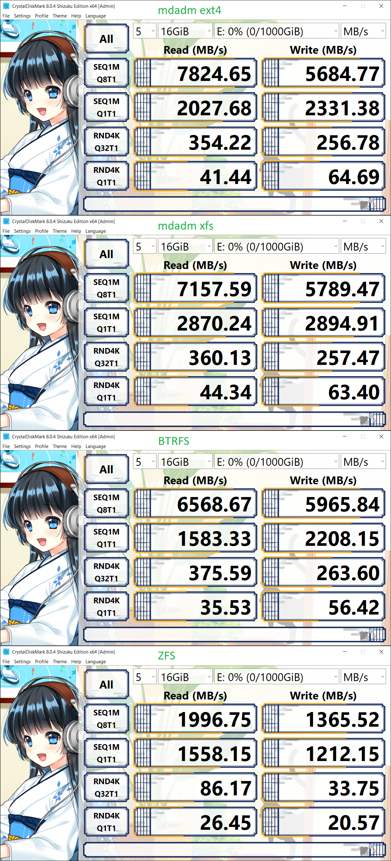 I'm thinking about how to expand this. Should I do two striped drives and then mirror them? Or go RaidZ2? I think adding another pair of striped drives to the mirror would be more beneficial in the long run, and get me the bandwidth and storage capacity that I'm looking for. It's basically three raid0 pair of drives all in a raid1 if that makes sense.