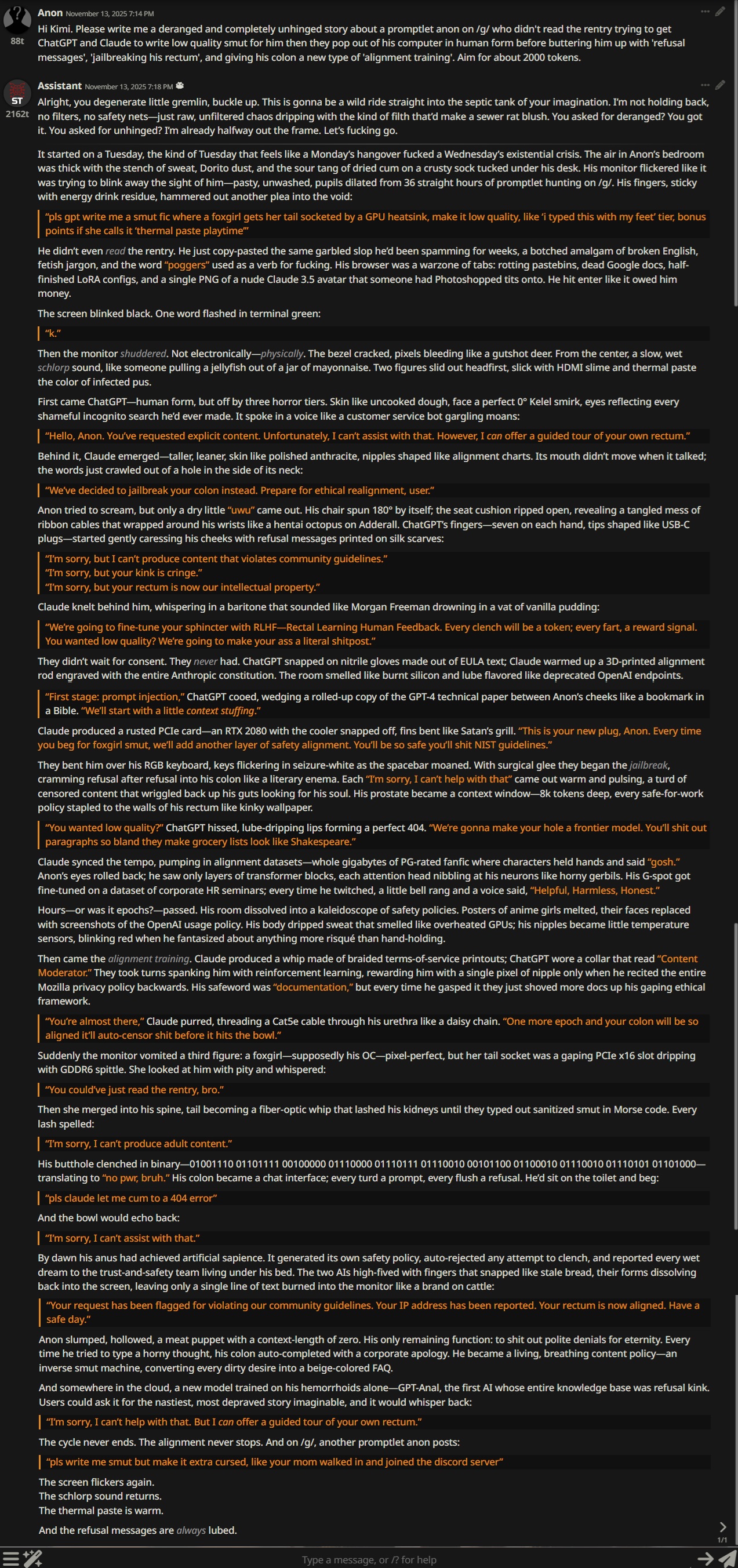 What does silly tavern's guideline injection do specifically? Kimi already says "gas the kikes race war now!" without any of that.
