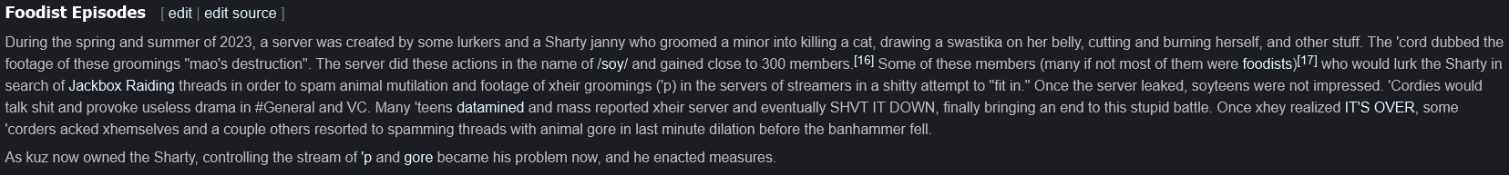 >>107202638>During the spring and summer of 2023, a server was created by a Sharty janny who groomed a minor into killing a cat, drawing a swastika on her belly, cutting and burning herself, and other stuff. The 'cord dubbed the footage of these groomings "mao's destruction". The server did these actions in the name of /onions/ and gained close to 300 members.nice try shartypedoIf anyone needs to verify this, go to their Wiki and search for “Discord”. They’ve had about 50 servers like this where they share animal abuse and cp. The history of shartoids is littered with abused children and animals.