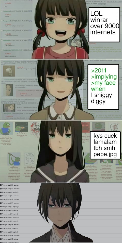 >>107195474In all my time on the internet it's strange to look back on the different periods/happenings that have come and gone. Many people have their own idea of a "Golden Age"(its funny to see zoomers call mid 2010s YouTubers "OGs" and reminisce), but I think people that try to force a return of a culture instead of doing their own thing is pretty pathetic.I would be more than happy to see things like "4 deh lulz" appear every once in a while, but to sound like every other asshole "You just had to be there". Never in my life did I think that someone would make an ongoing CWC docuseries that would be watched by millions of normalfags. It will forever be strange to me that people will watch "Video Essays" on our old internet shenanigans. For me I very rarely talked to anyone irl about trolling/invasions or really about memes. The net stayed on the net. Now so many people are excited to share their "esoteric findings" and even capitalize on it.Sometime between GamerGate and "The Great Meme War of 2016" many people(not just normalfags) set out to try and mark themselves as "Internet Legends" by rehashing everything they have ever seen in the crudest and most uninspired way possible.The net is still a great deal of fun, but if you choose to only be a distant spectator that waits to be spoon fed their excitement, then perhaps you have no reason to complain about how things suck.4chan will still be fun as it will always attract people that will keep it exciting one way or another, but do checkout other areas of the internet. Also, IRC will forever be the "sanest" and most fun you can have with a 'puter connected to the information super highway.