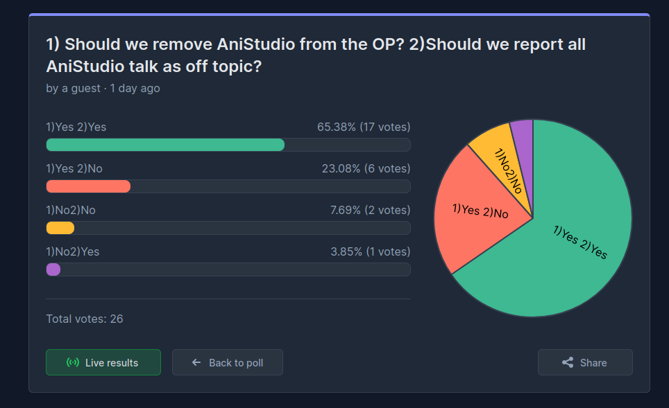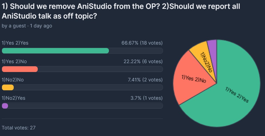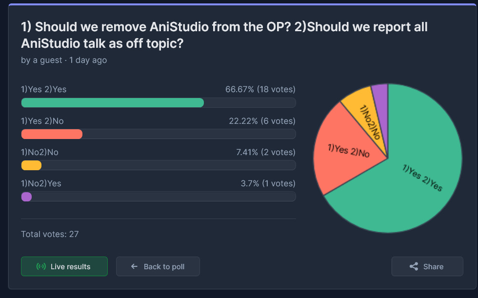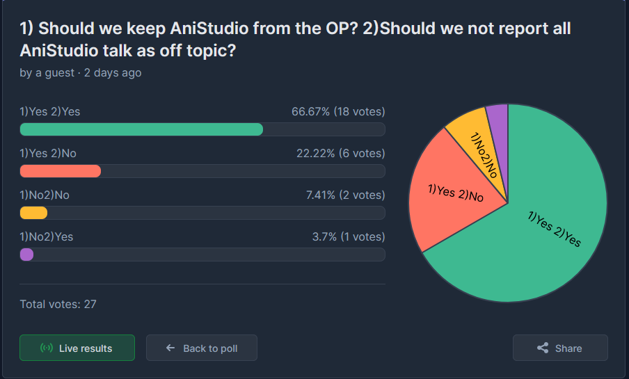 after two days the poll is over>1) Should we keep AniStudio in the OP? 2)Should we not report all AniStudio talk as off topic?you anons voted and YES we are going to keep anistudio in OP and YES we won't report anistudio discussion! thanks for voting!