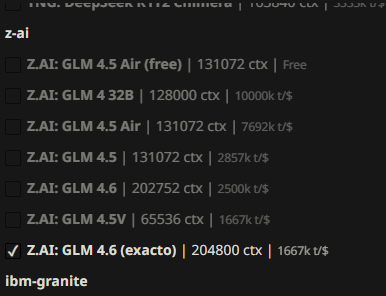What is the difference between GLM 4.6 and 4.6 Exacto? More recent build? Larger model?
