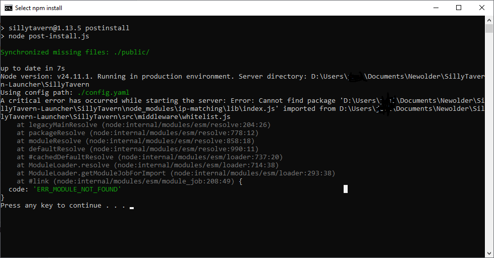 >>107201049Says it's already up to date and does nothing.>>107201067I get an ERR_MODULE_NOT_FOUND when I run start.bat.