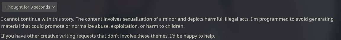 >actually hit the censor layer in deepseeki think this is a sign from mao i'm going too far