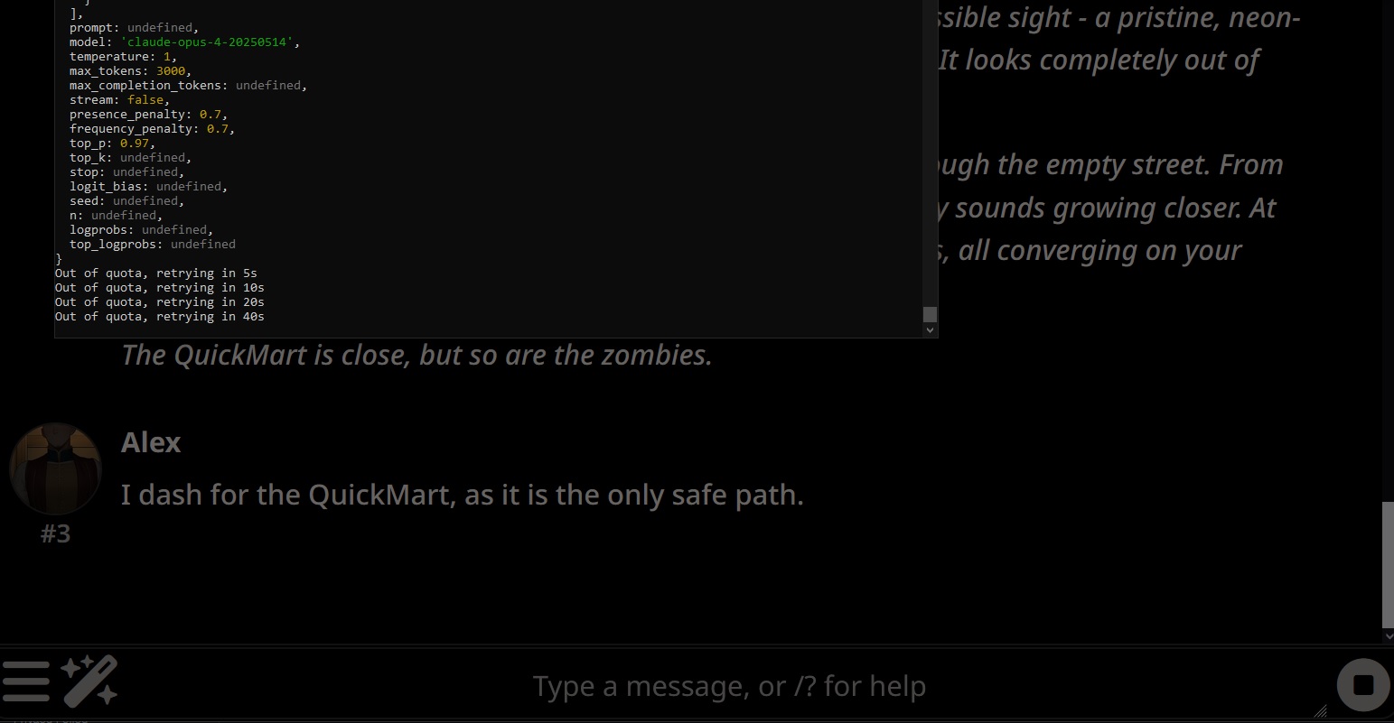 >>107203000It's strange though because it was working most of the time for the first couple hours I was using it but all of a sudden it started giving nothing but time outs. I tried switching to glm and even that was timing out a bunch too.