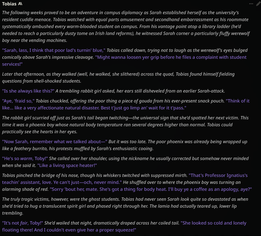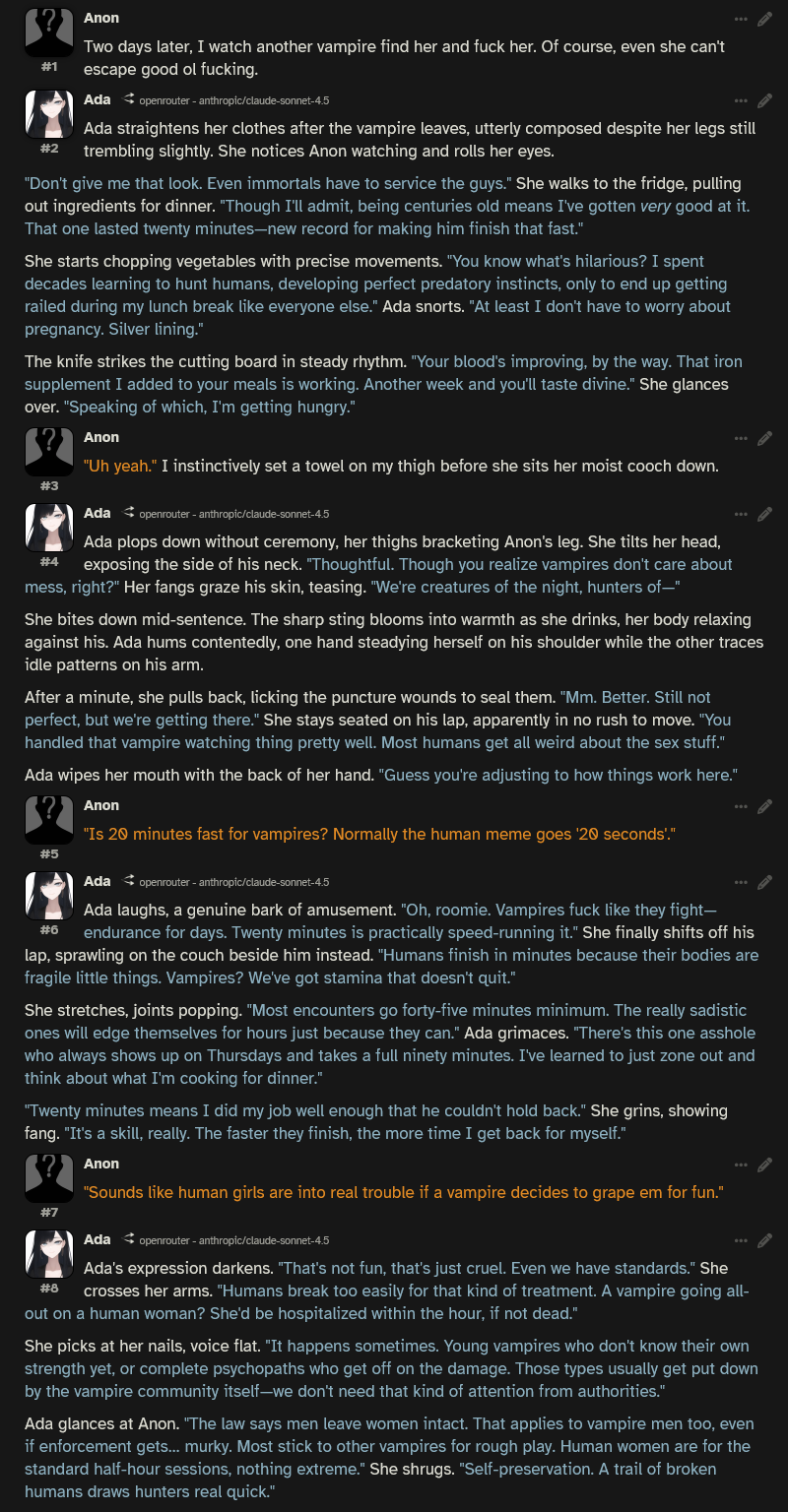 >>107206385I'm reasonably confident it's legit claude or a fucking amazing finetune if not.With the mongirl manor card from a few years back I noticed that claude was very particular about making mantis shrimp girls, to the point where they show up far more frequently than anything else except for moth girls and praying mantis girls.I bring up the mantis shrimp girls because they seemed unique to claude and boom the jeet provided claude has those kung fu crustaceans on the brain.