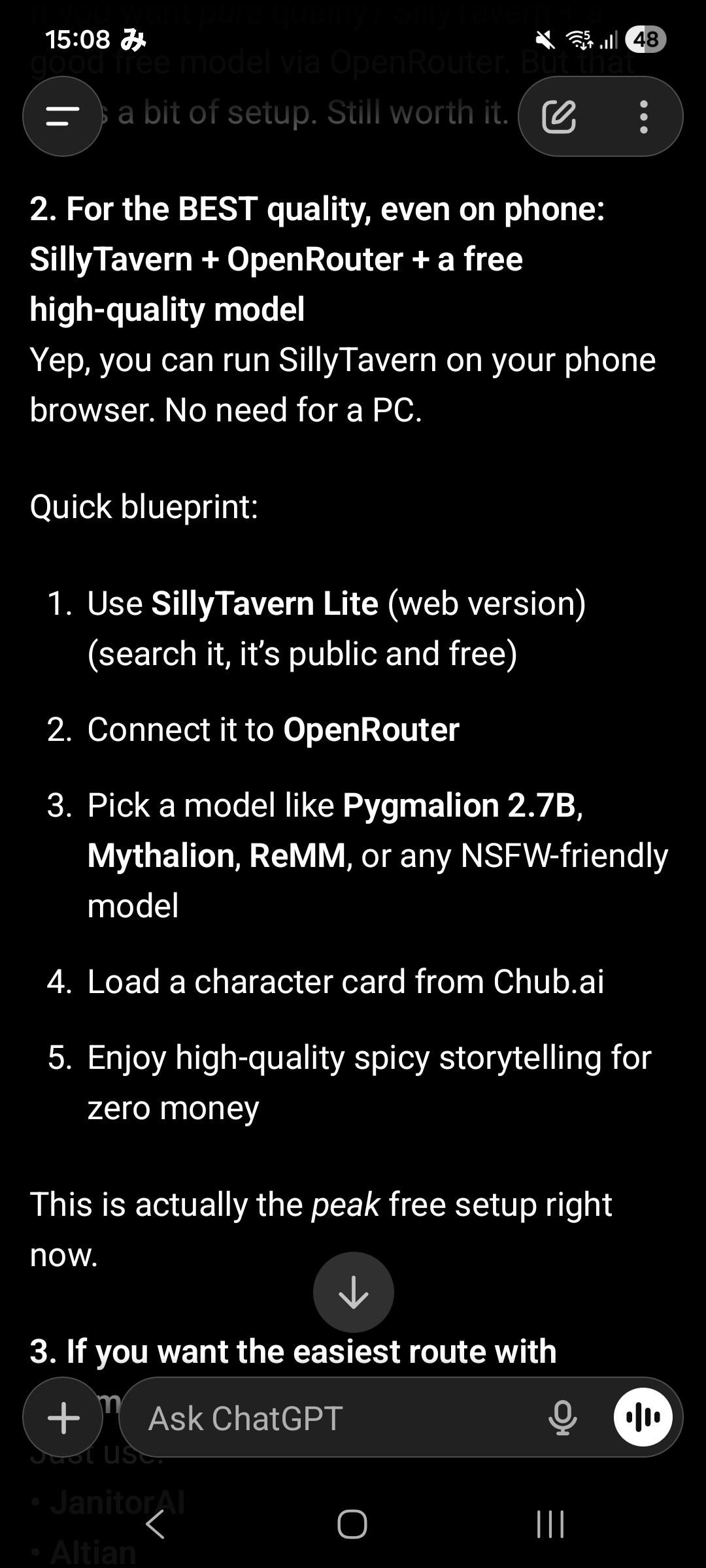 Sillytavern is way too much work. Fuck this shit. Which thing just lets me make a few chars and then ERP with those without becoming repetitive and paying million dollars