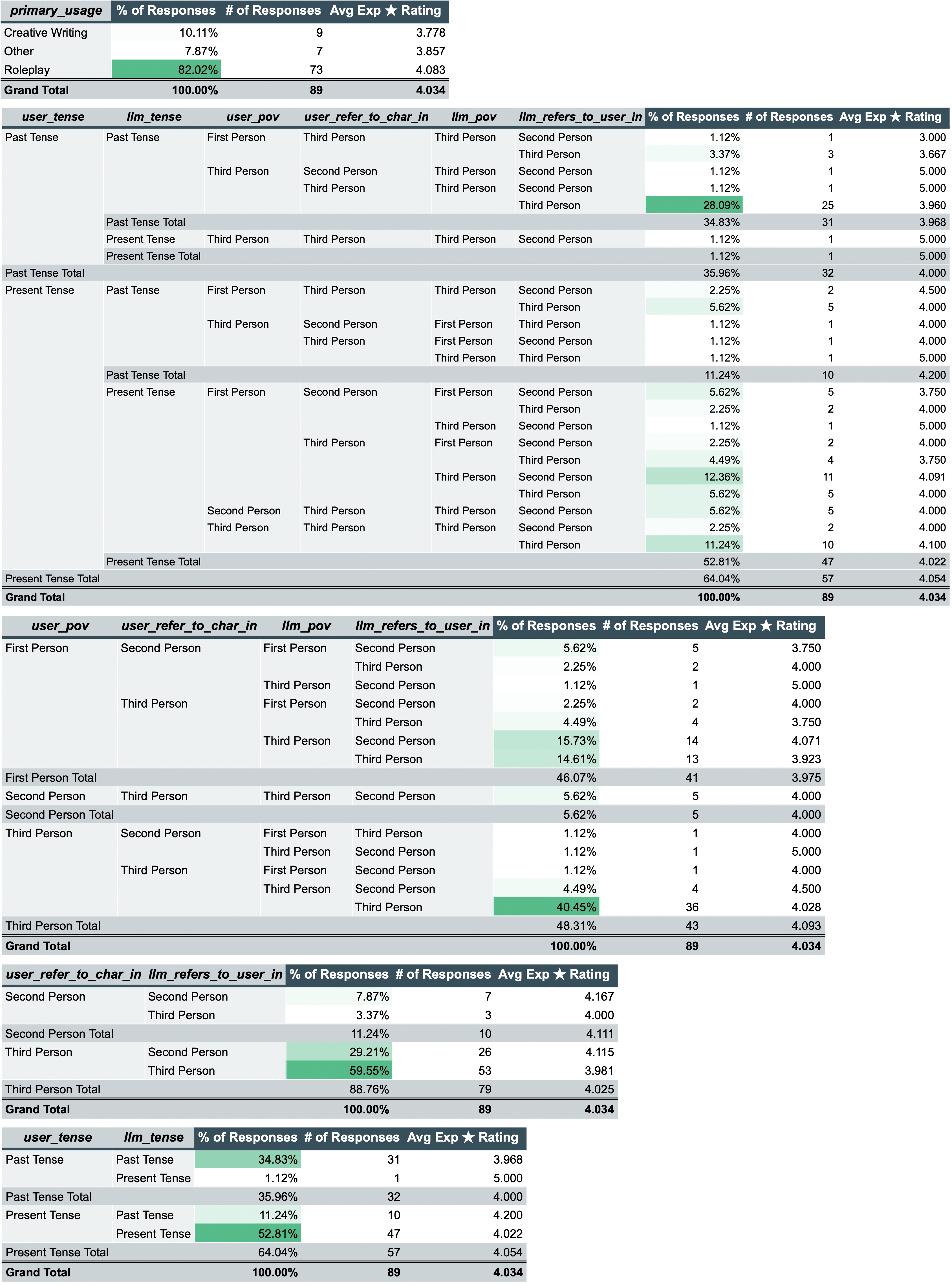 >>107223404I already had a hunch most people would prefer fully third person and fully past tense, but it's interesting to see the variance and to confirm with numbers. Then there's the traditional 1-on-1 "internet style roleplay" where each participant refers to themselves in first, but refers to the other in second, like: Person A: I pull you in for a kiss.Person B: I slap you in the face before you can.>>107223404 previous post for anyone else who hasn't seen it yet.Preferred POV & Tense Survey8 questions, multiple choice only, no emails collected (but you need a google account)Currently n=89Google Form: https://forms.gle/HEYenPGomJh9AqzW6Google Form's live auto-generated results summary (no login needed): https://docs.google.com/forms/d/e/1FAIpQLSeTz7fAsNi8g6AFYbOTGq0MnfiphxuWcy36gkcTZFcTREW2gg/viewanalytics
