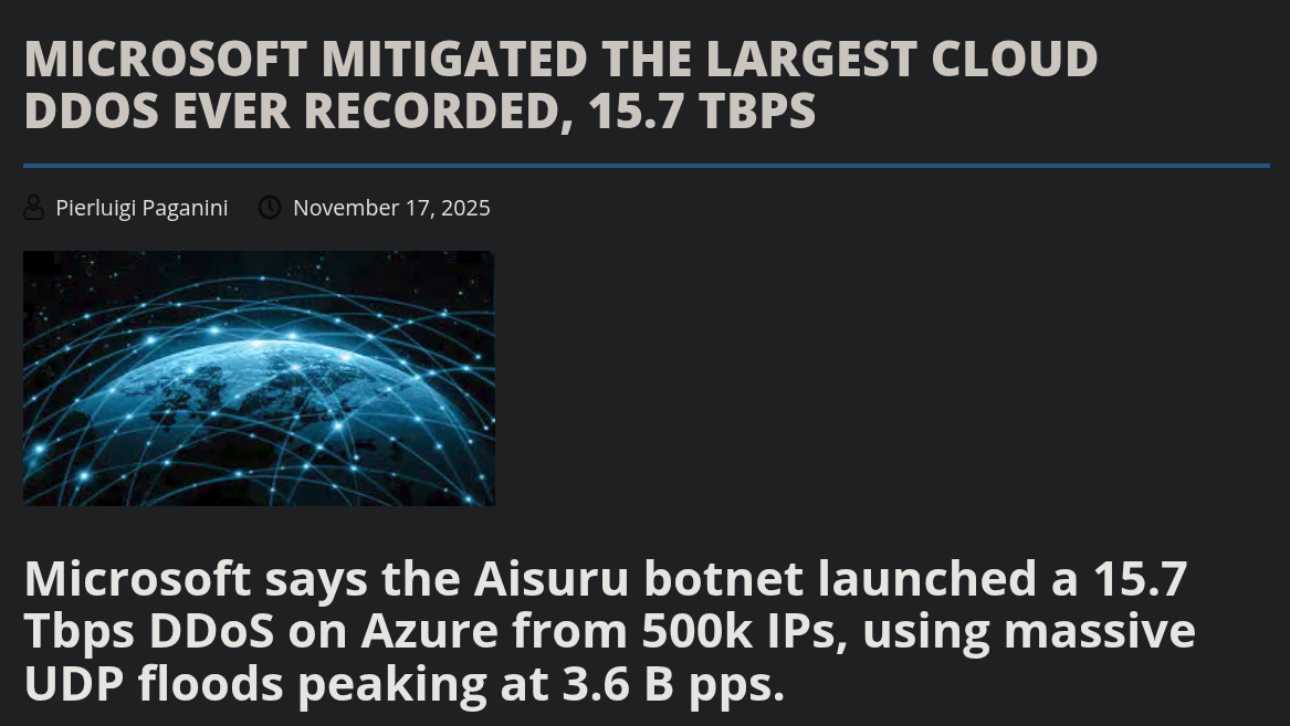 https://securityaffairs.com/184749/cyber-crime/microsoft-mitigated-the-largest-cloud-ddos-ever-recorded-15-7-tbps.html