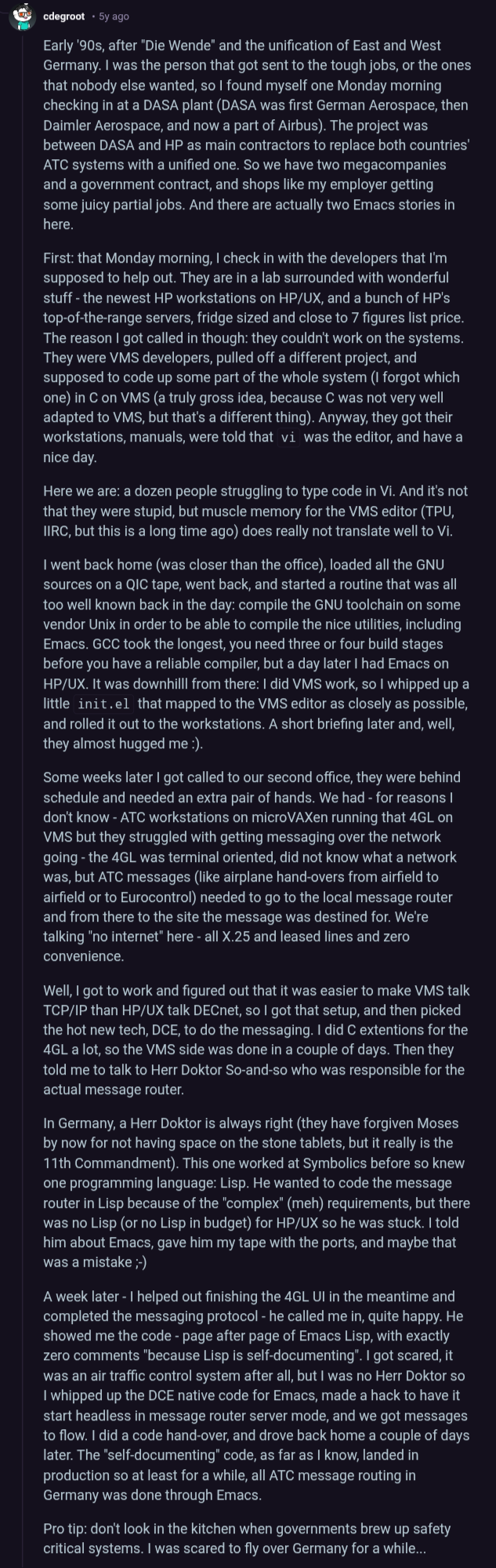 >Emacs is an extensible, customizable, self-documenting free/libre text editor and computing environment, with a Lisp interpreter at its core.