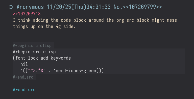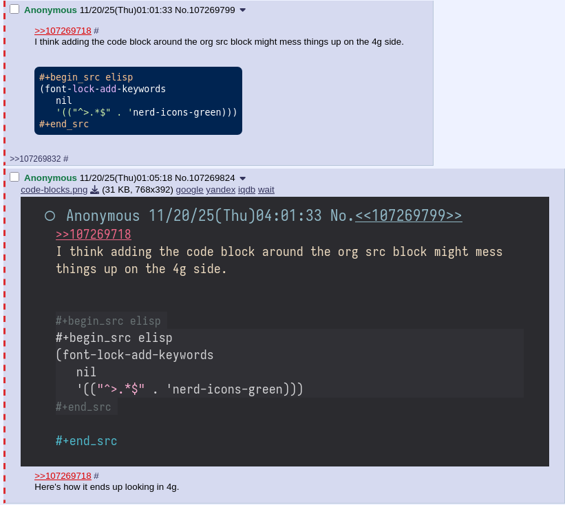I think adding the code block around the org src block might mess things up on the 4g side.