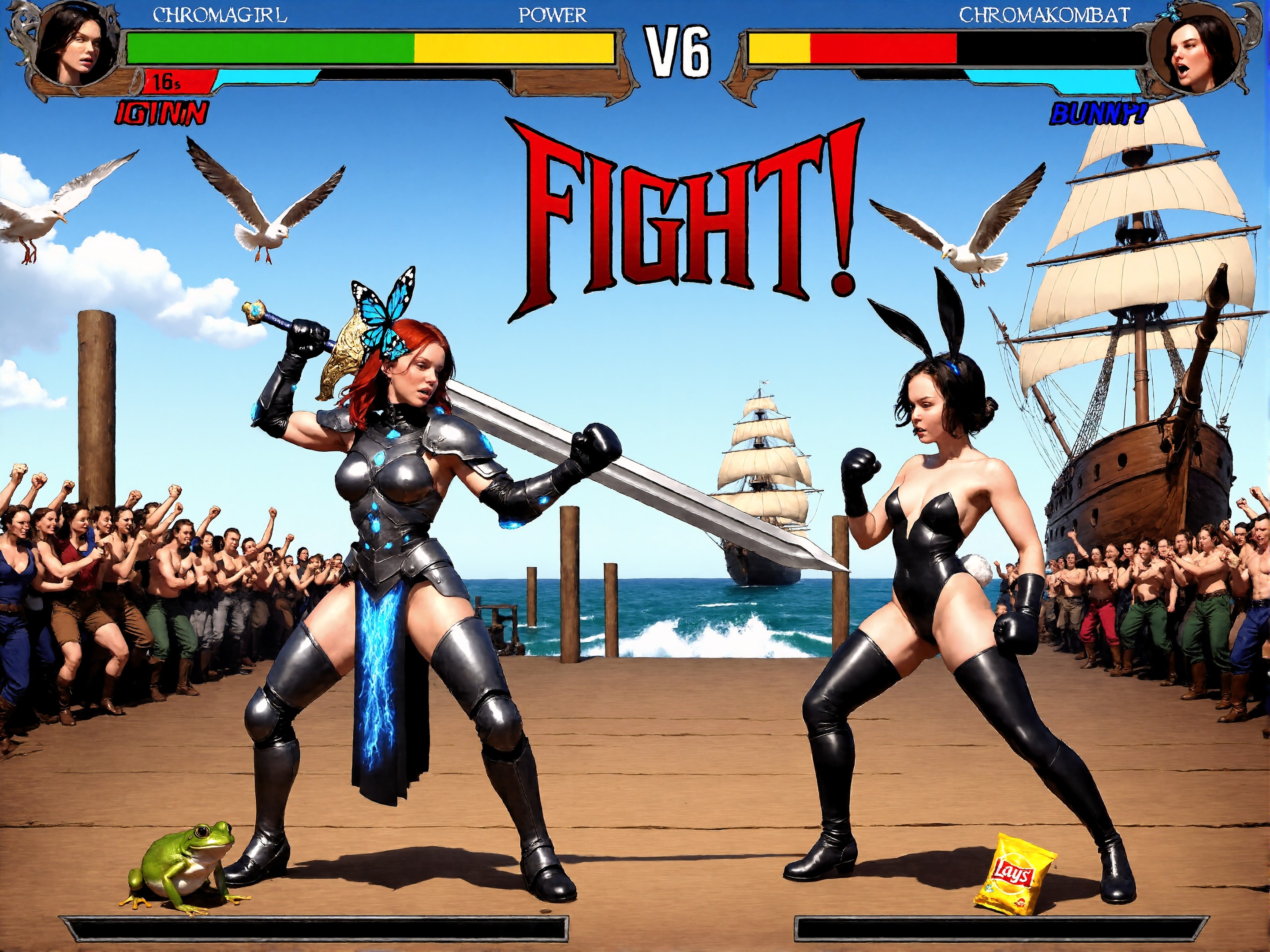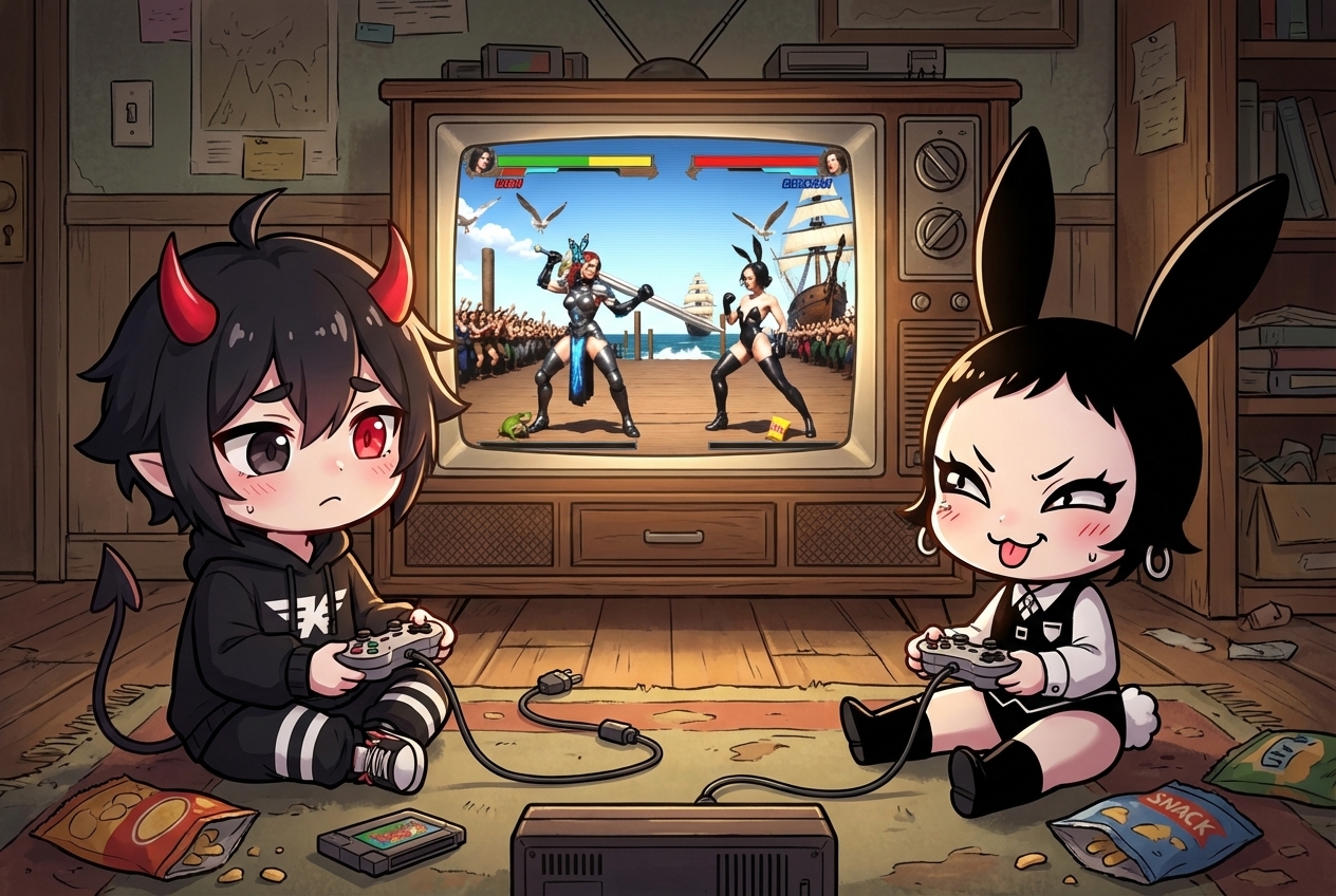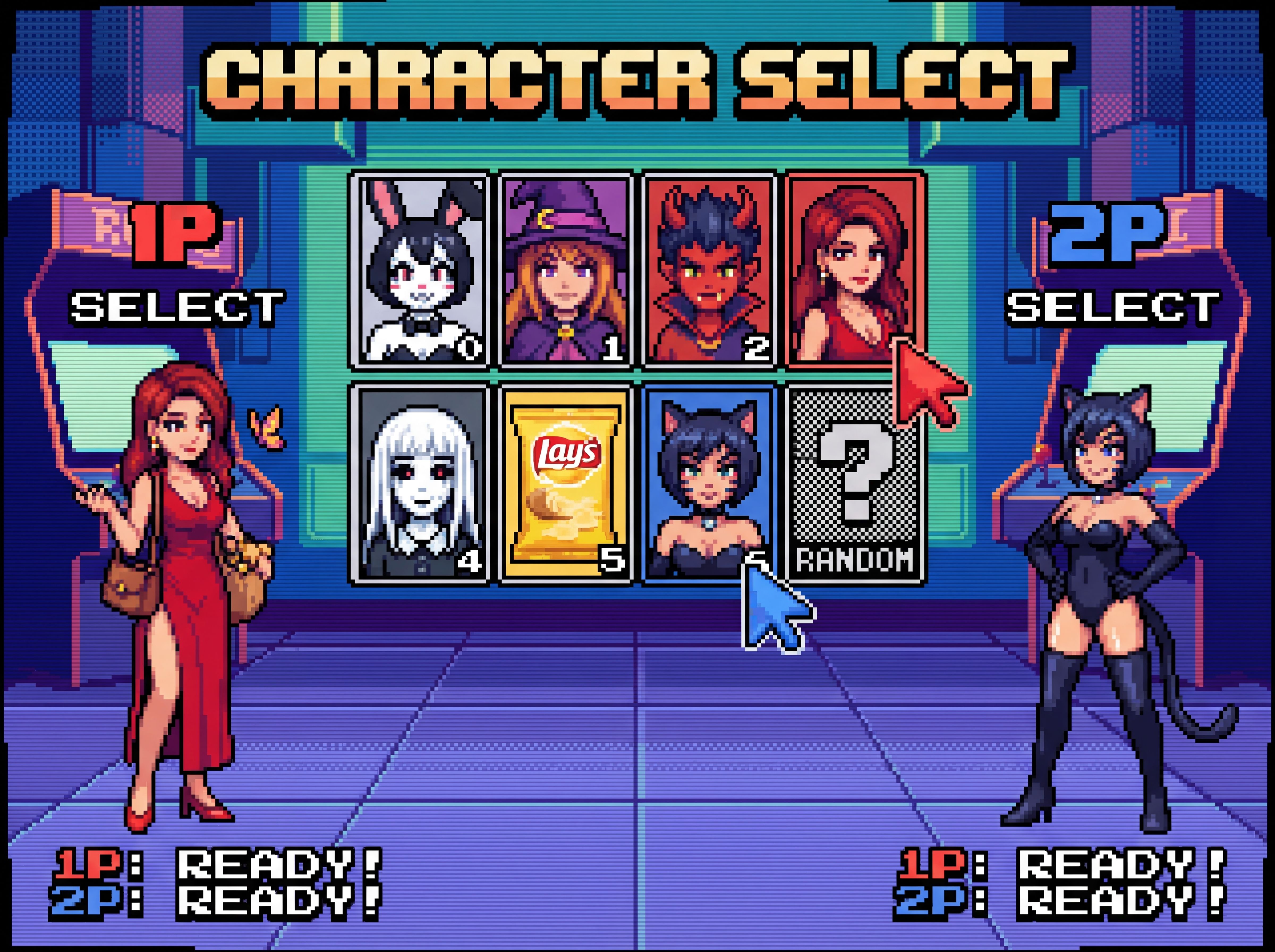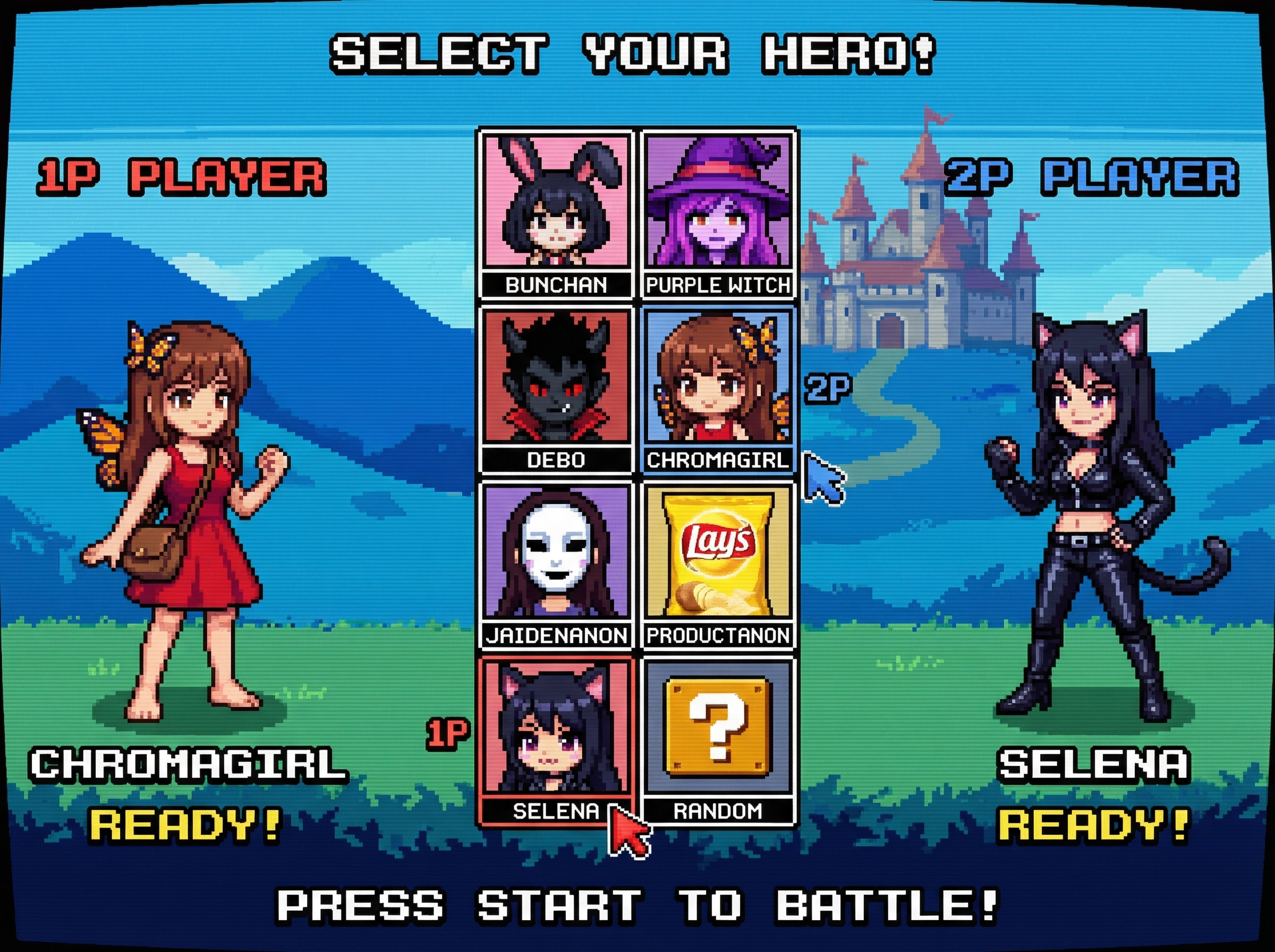 Show each player's chosen character on their respective side (1P: LEFT, 2P: RIGHT). Their CHOSEN CHARACTER are the last two attached images. They are in an idle stance suggested by the character design.