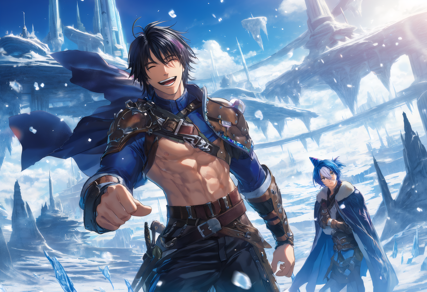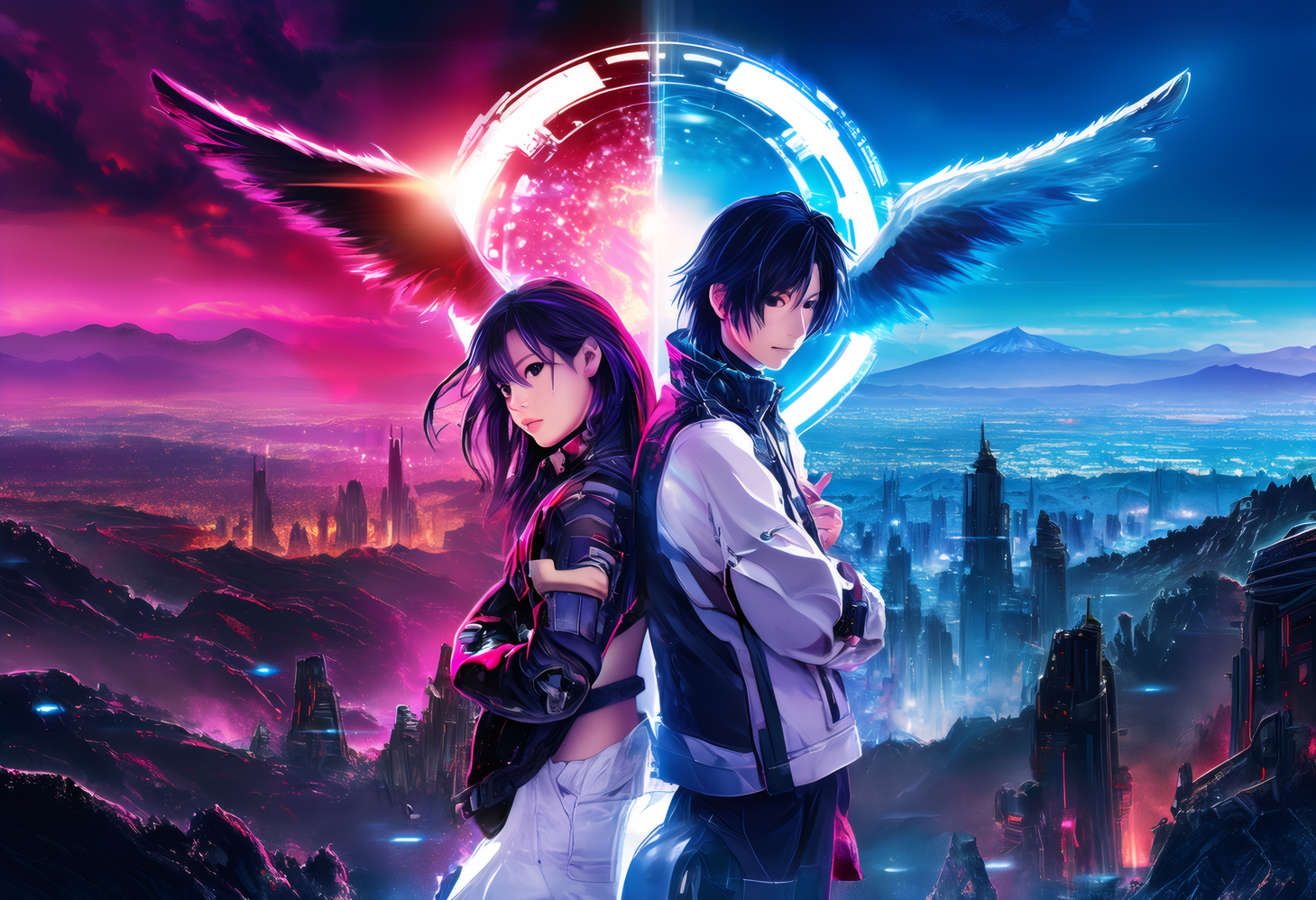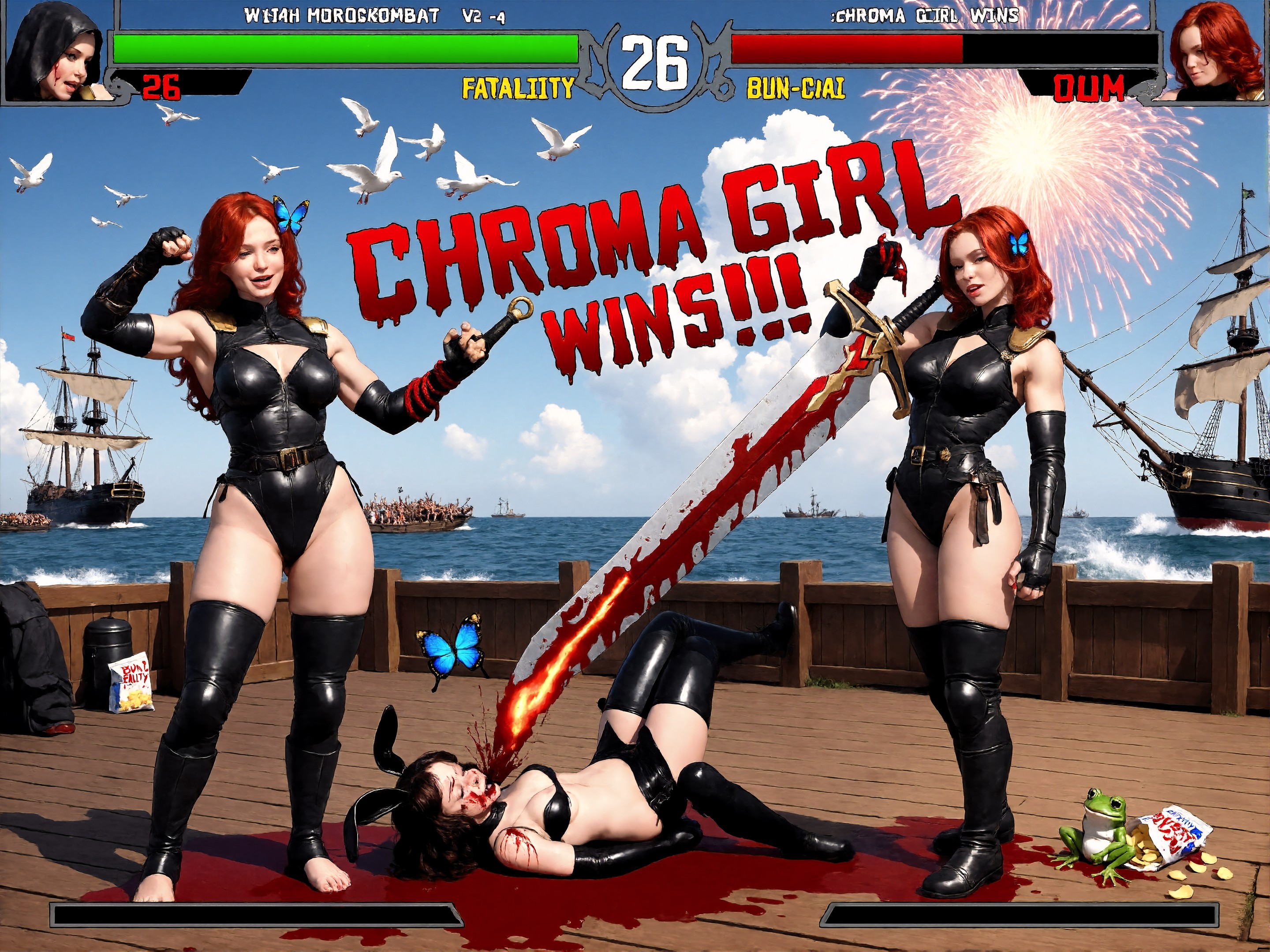 Show each player's chosen character on their respective side (1P: LEFT, 2P: RIGHT). Their CHOSEN CHARACTER are the last two attached images. They are in an idle stance suggested by the character design.