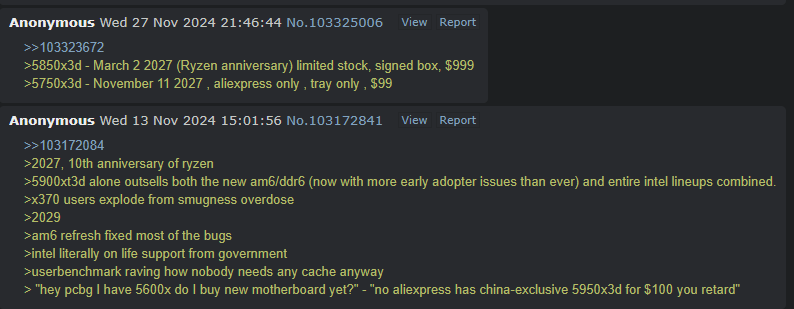 >>107313507>tard doesn't understand memory latency at all, looks at a singular timingAverage AMD user. This is why they need so much cache on the chips, because their memory is running in the worst possible configuration because they struggle.>>107313533>amd has been using the same memory controller since zen 2True that's why everything sucks on it when it doesn't have mega cache.>imagine with the new revamped zen 6 memory controller, it's over for lip bu tangAMD isn't ready for Intel's 54 core BBC (Big beautiful last level cache)
