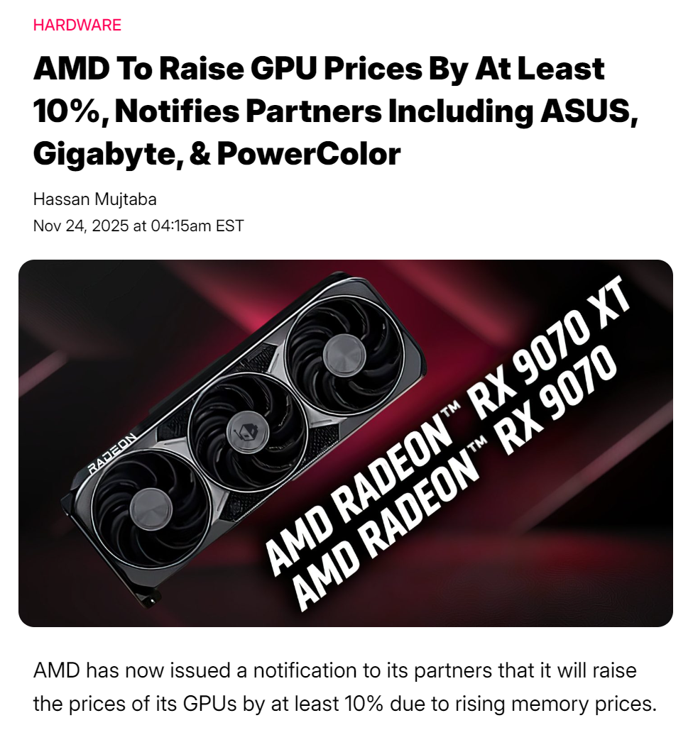 >News & RumorsRTX 50 Super: 2026 launch delayed. 24GB VRAM for 5070 Ti & 5080 Super, 18GB for 5070 Super.Nova Lake 2026Dual 3d cache "9950X3D2"Redstone "Ray Regeneration" is in Black Ops 7, full announcement Dec. 10.New Steam hardware>OmissionsRTX 5070: buy if it's reasonably priced & if you plan to work around potential VRAM bottlenecks.RX 9070 non-XT: worth considering if it's significantly cheaper than the 9070 XT.Intel 13 & 14th gen i7/9 -K CPUs: BIOS update required due to reliability issues. 1.4V or 1.45V CPU VR voltage limit recommended.>Product NoticePNY RTX 50 cards have QC issues (rattling fans, reports of 5070 & 5090 with blown capacitors)Gigabyte RTX 50 & RX 9000 video cards: thermal gel has QC issues, Gigabyte claims only early production batches were affected.https://www.igorslab.de/en/update-on-thermal-putty-on-gigabyte-graphics-cards-after-further-storage-oil-separation-to-an-alarming-extent-and-silence-as-a-strategy/>PSU Reviewshttps://www.tomshardware.com/pc-components/power-supplieshttps://www.lttlabs.com/https://www.kitguru.net/reviews/?category_name=power-supplieshttps://www.techpowerup.com/review/?category=Power+SuppliesFor tier-list enjoyers:https://docs.google.com/spreadsheets/d/1akCHL7Vhzk_EhrpIGkz8zTEvYfLDcaSpZRB6Xt6JWkc/>Storage Reviewshttps://www.phoronix.com/reviews/Storage (Linux performance)https://www.tweaktown.com/cat/storage/index.htmlhttps://www.techpowerup.com/review/?category=SSDhttps://www.tomshardware.com/pc-components/storage/ssds/reviewshttps://www.servethehome.com/category/storage/>Monitor Hunterhttps://docs.google.com/document/d/1illeNLsUfZ4KuJ9cIWKwTDUEXUVpplhUYHAiom-FaDo/