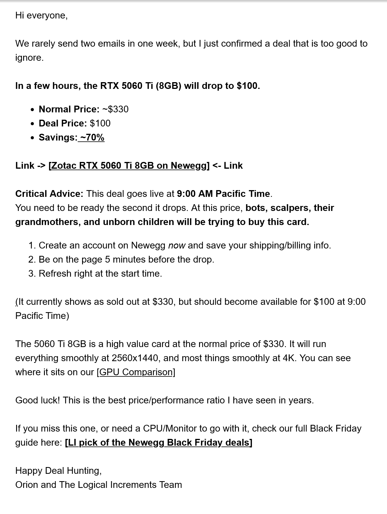 RTX 5060 Ti apparently going on sale for $100 (70% discount) in about 2 hours (9am Pacific), according to a Logical Increments newsletter email.